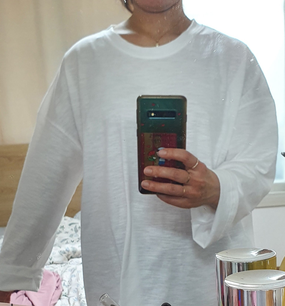 The slub fabric is comfortable and the form is oversized The white is not that see-through so I like it Also got one of these in pink |