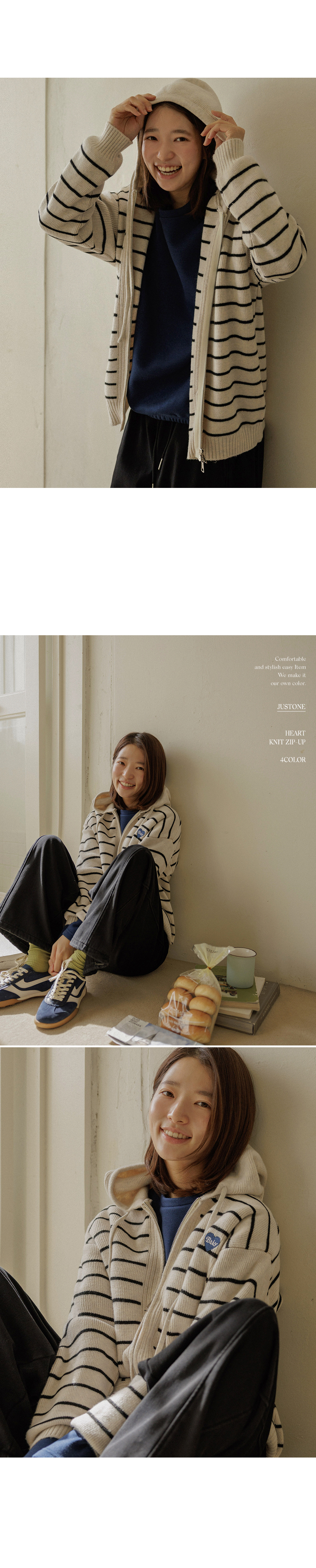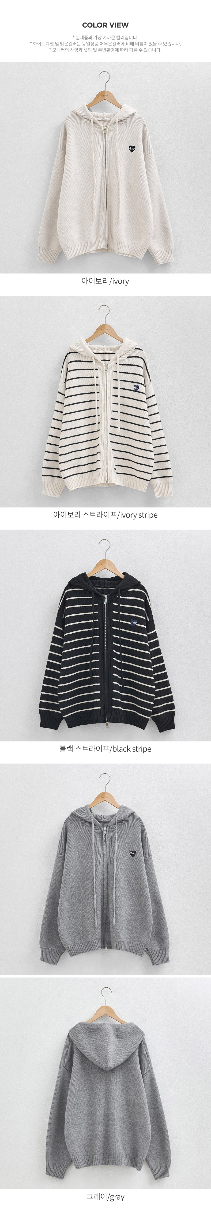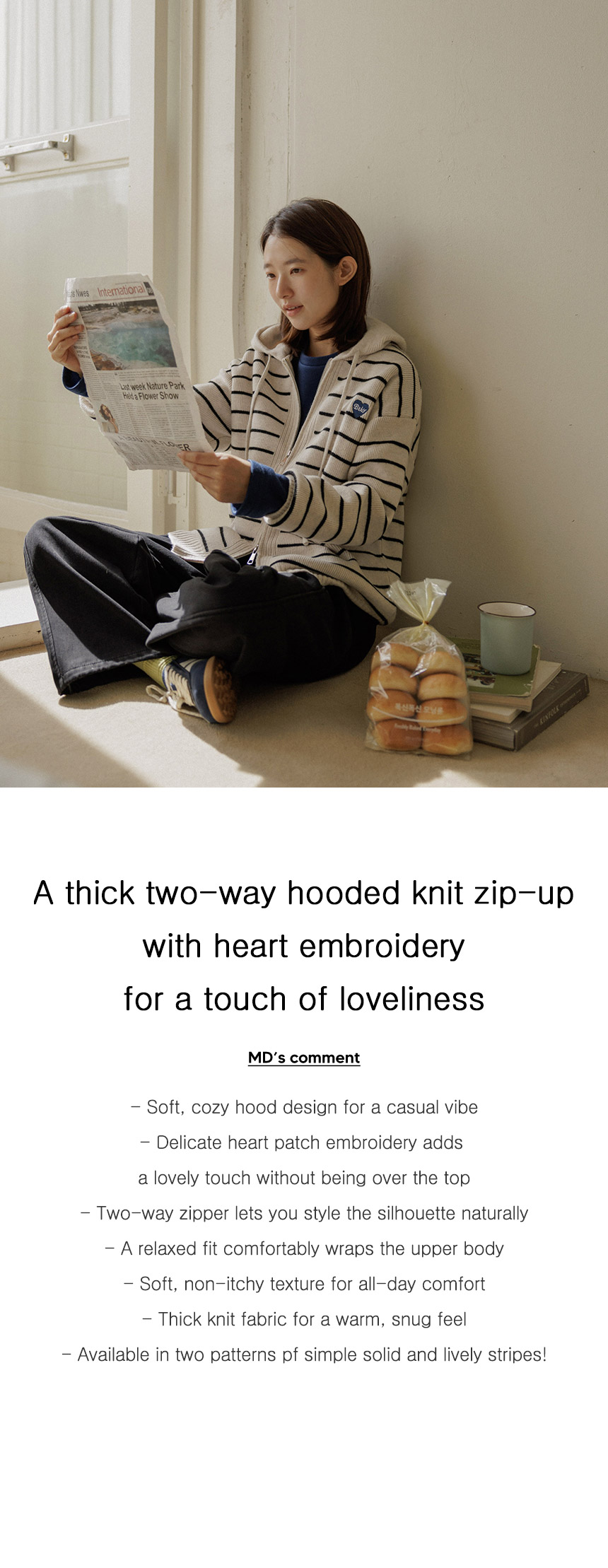 This hooded knit zip-up features a cute heart patch embroidery and a relaxed, comfortable fit. It’s available in two patterns of a simple solid color and a cheerful stripe, so you can choose the style that best suits your taste!
