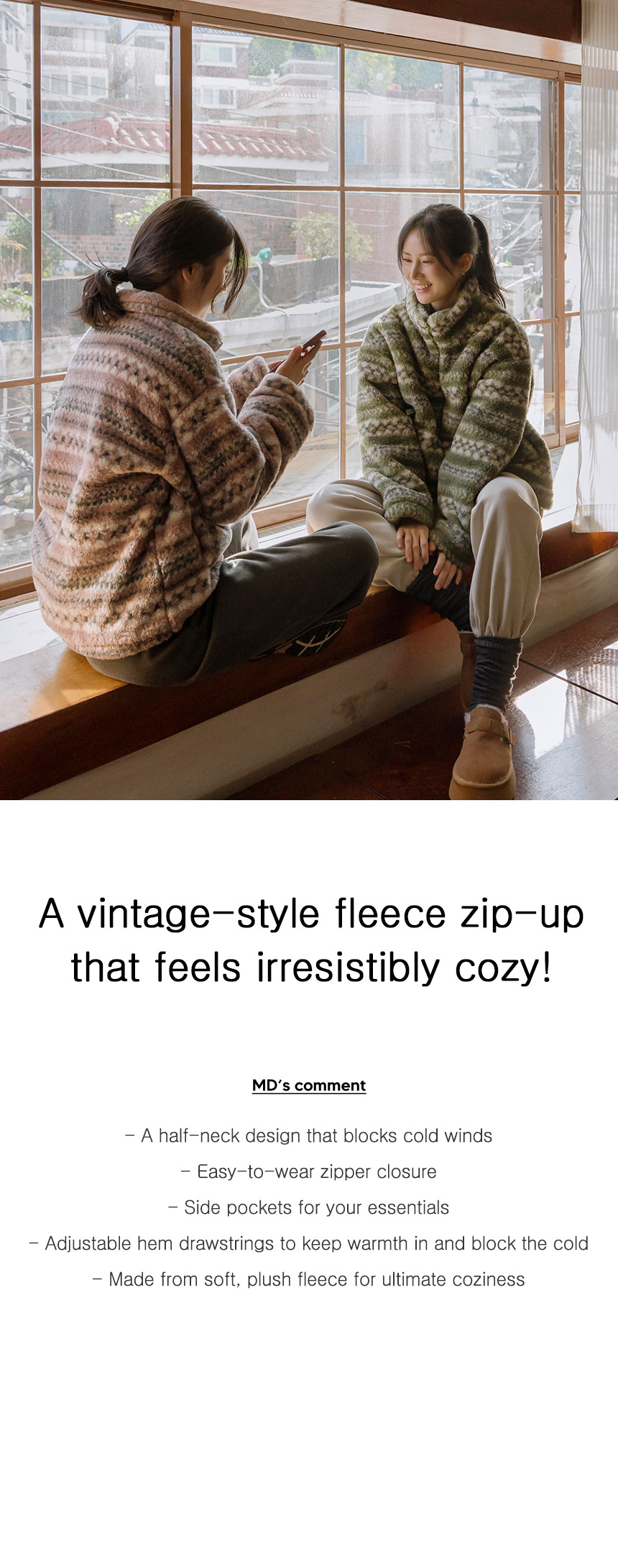 This zigzag fleece-lined zip-up has a vintage vibe and a soft, cozy feel. It’s a warm piece that’s perfect for camping or travel - highly recommended! :)