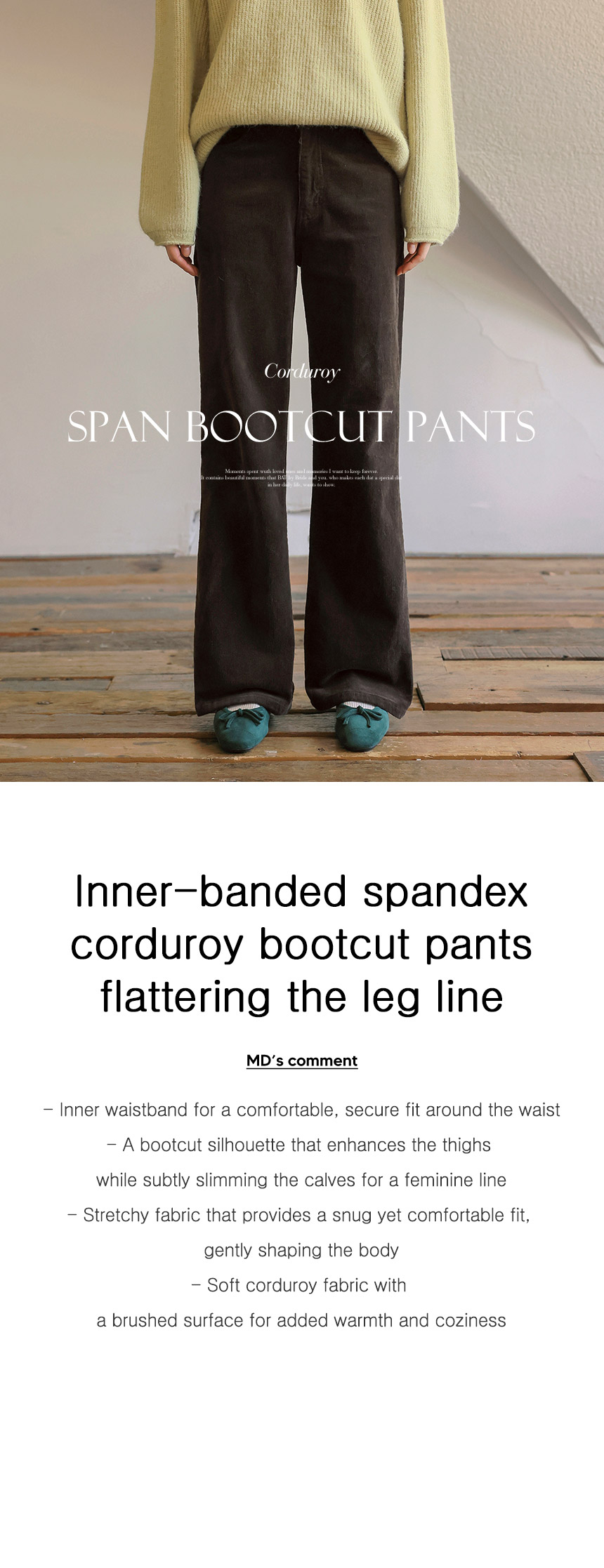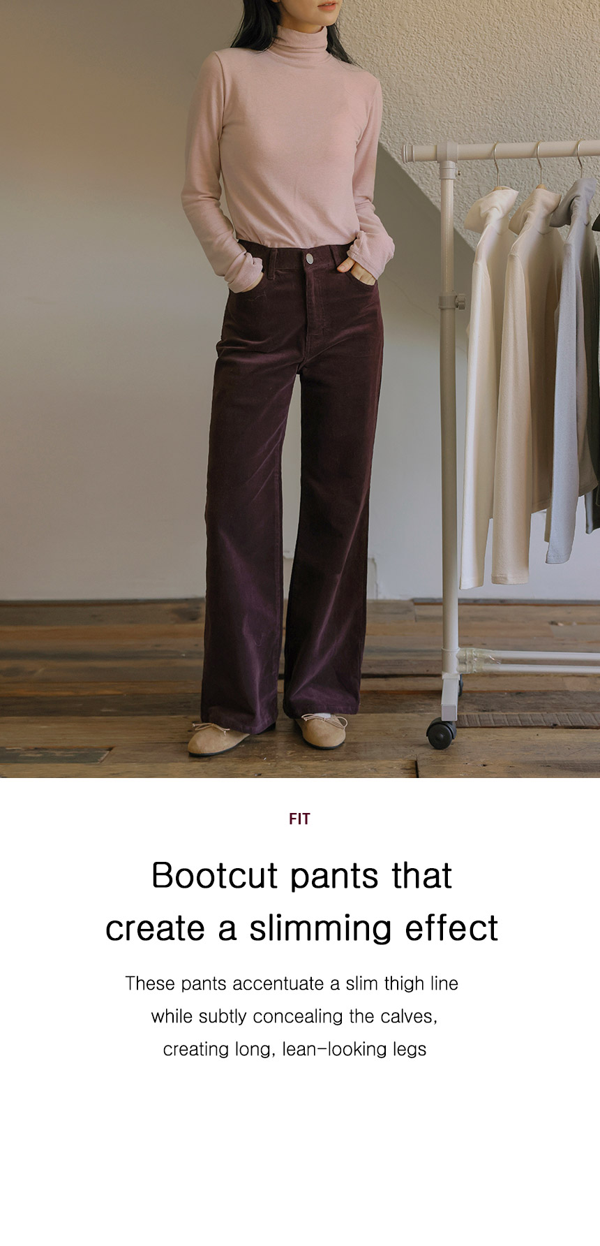 Show off your thighs and hide your calves! These bootcut pants flatter your overall leg line. The in-banded design and elasticity make them comfortable to wear whole day. And the fleece-lined corduroy fabric keeps you warm as well. ♥