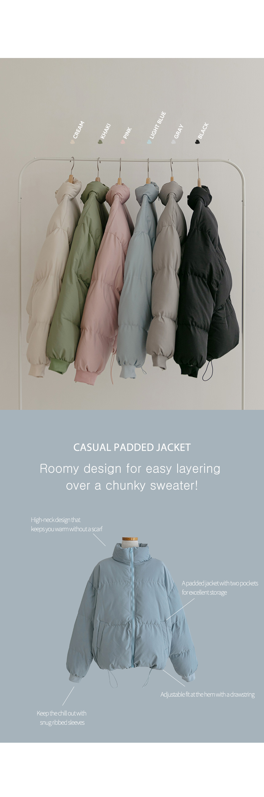This is a light and warm outerwear made with Wellon material! The pretty pastel colors are attractive, and the roomy fit and semi-crop length make it cute!