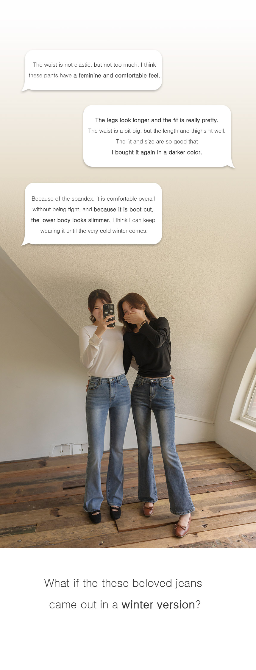 These pants are made of thick and warm bonding brushed material and have a bootcut design that makes your legs look slimmer!