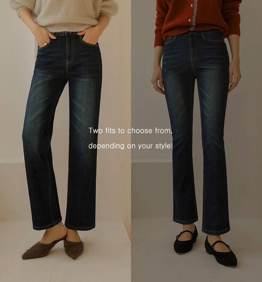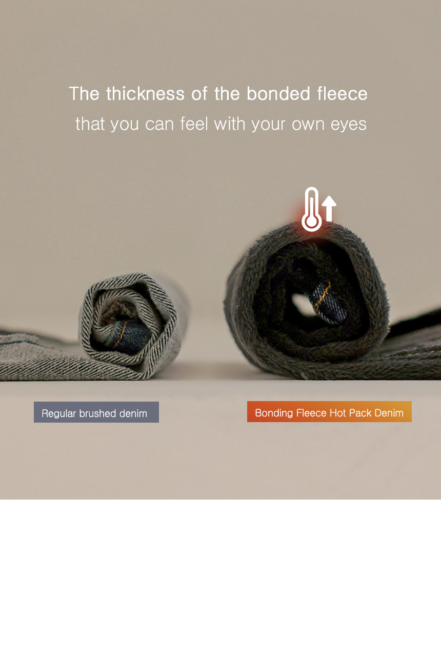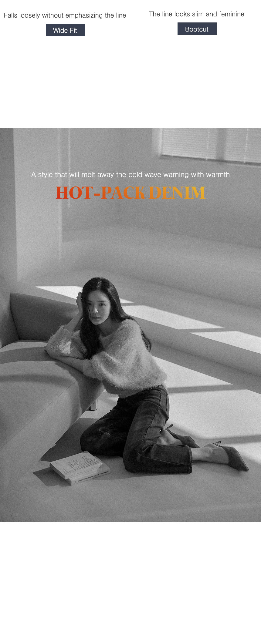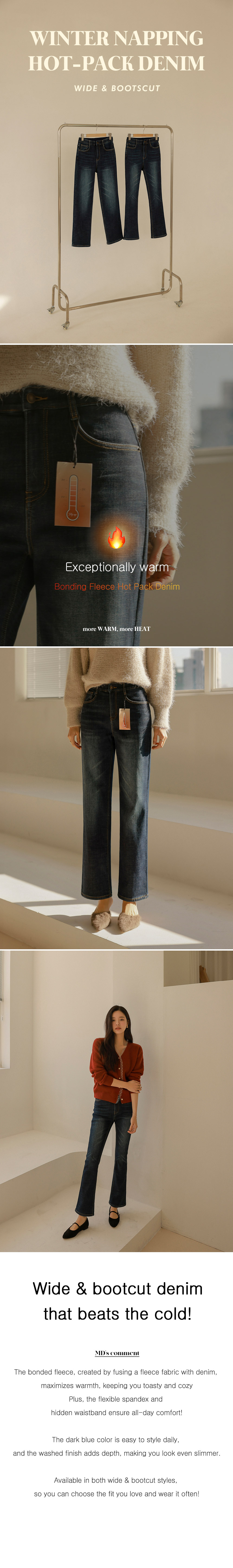 Denim that keeps you warm like a hot pack with thick bonding fleece! You can choose from two fits - bootcut and wide, depending on your preference. It is a comfortable item with a waistband and flexible spandex~