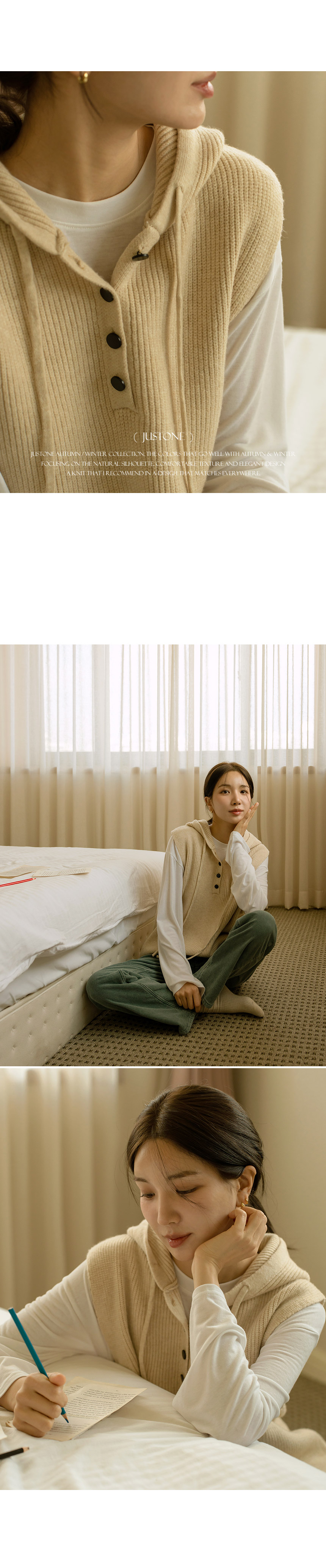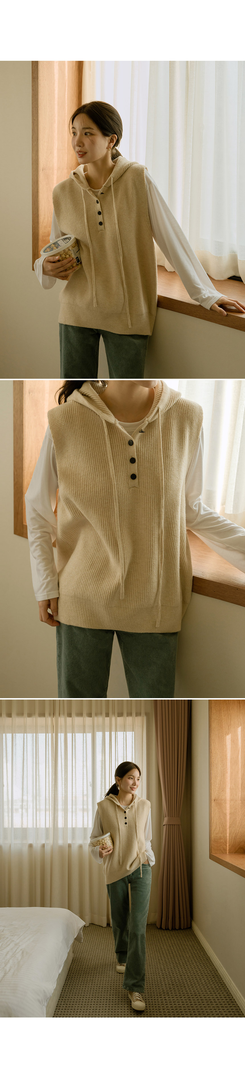 This is a comfortable knit vest with a loose-fit design covering the hips, and the hooded design with buttons creates a casual mood.