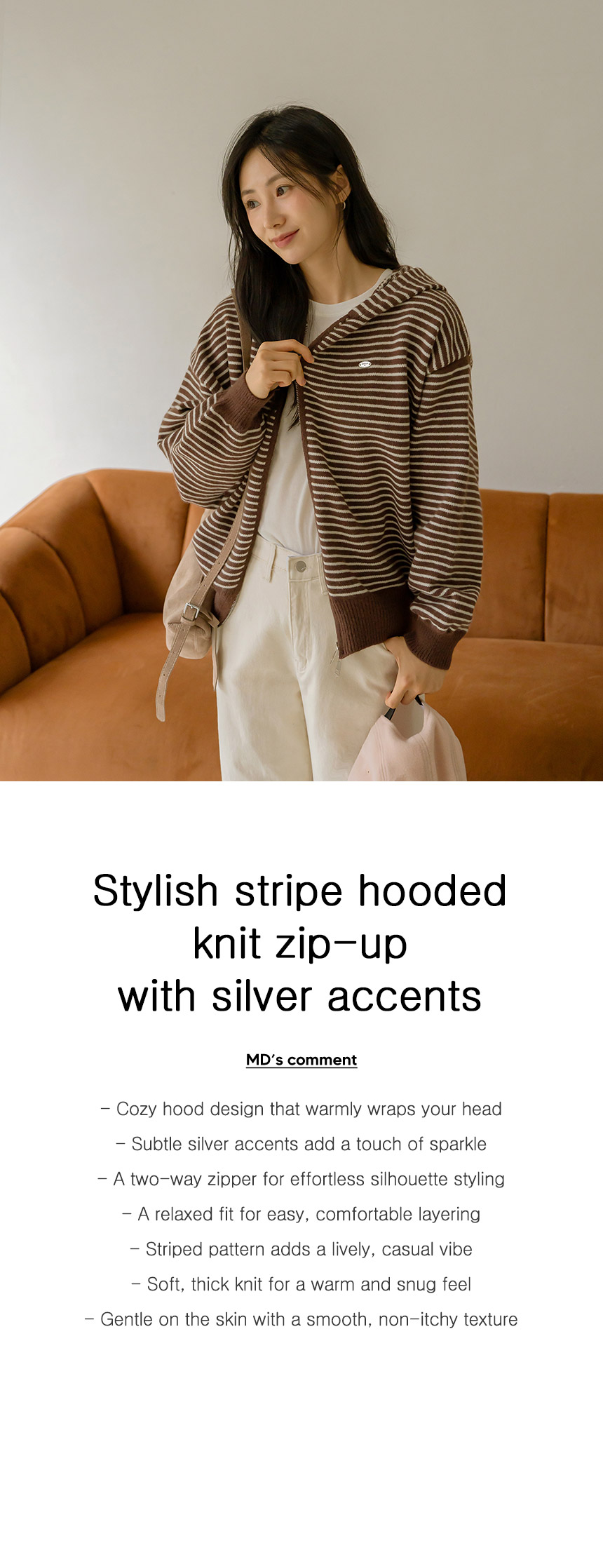 Cozy zip-up hooded knitwear with a touch of shimmer! This piece features elegant silver trim that subtly catches the light, adding a refined accent. Its thick, fluffy knit provides excellent warmth, while the understated stripe pattern offers a relaxed, casual vibe without feeling overdone.