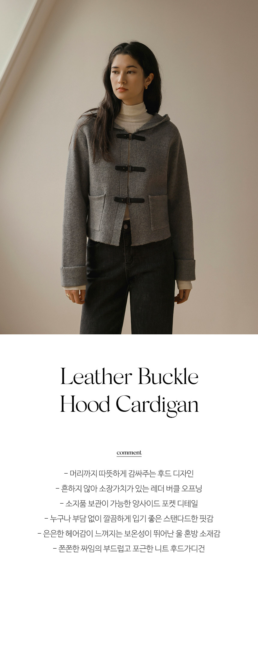 A hooded cardigan with a luxe twist!Featuring a leather buckle closure that adds a refined touch, this piece is crafted from a delicate wool-blend knit for exceptional warmth. The tightly woven fabric maintains its shape over time, so you won’t have to worry about stretching!