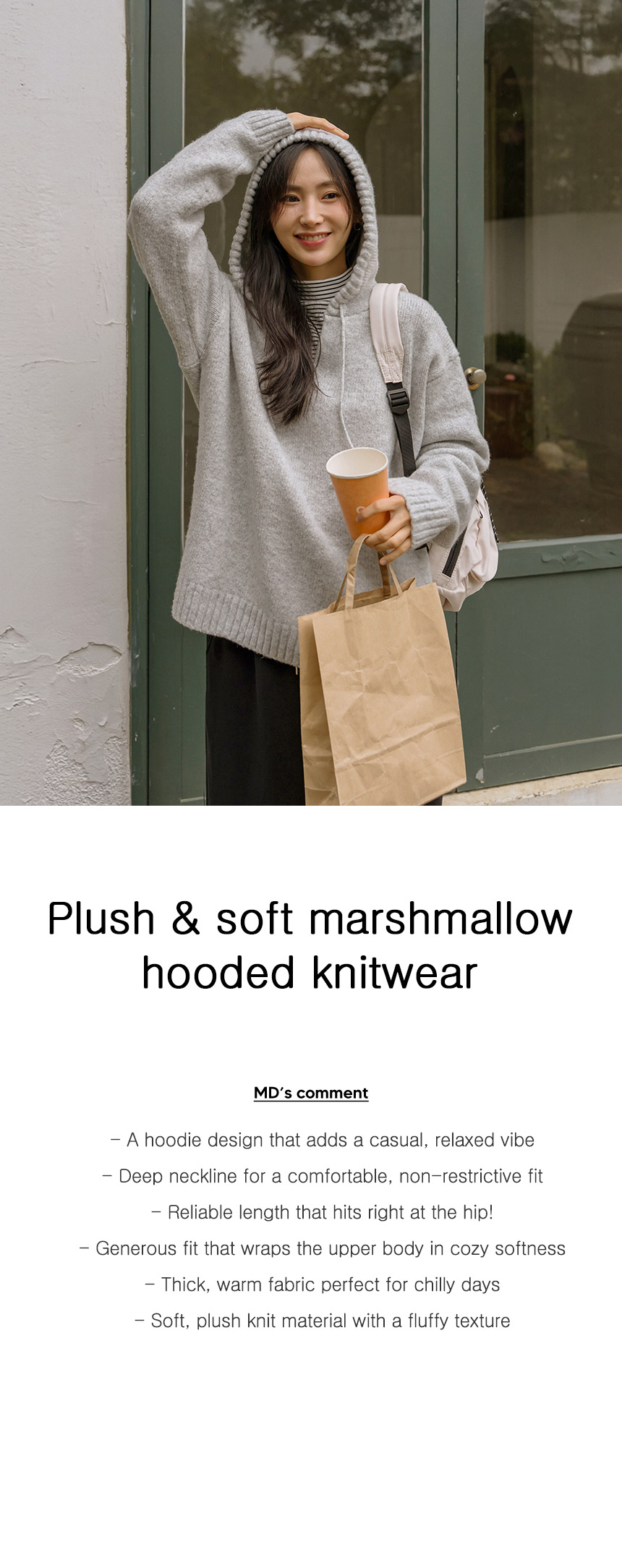 A cozy item made with soft, fluffy knitwear! The voluminous hooded design exudes a casual vibe, and the generous fit and hip-length make it comfortable for anyone to wear.