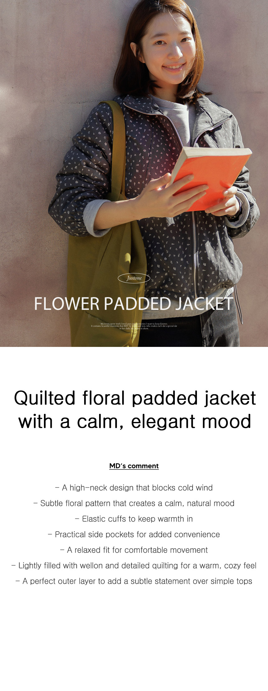 This padded jacket is accented with a delicate floral pattern that feels feminine and lovely. The lining is well-selected, so you can feel cozy and warm when you wear it :)