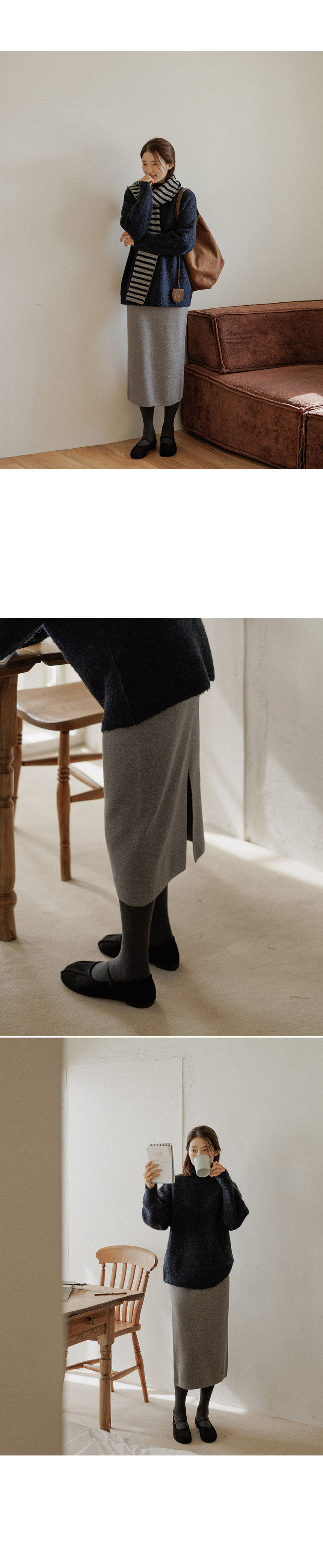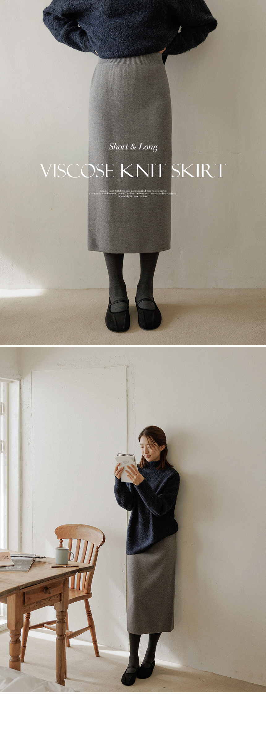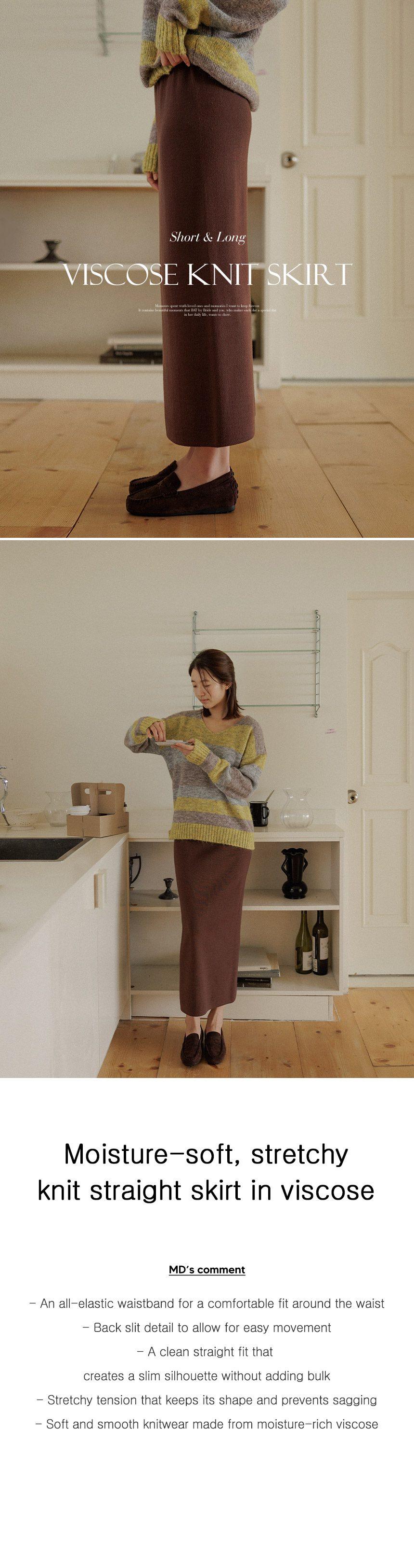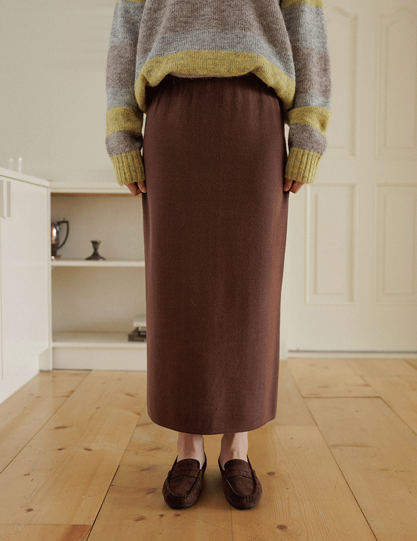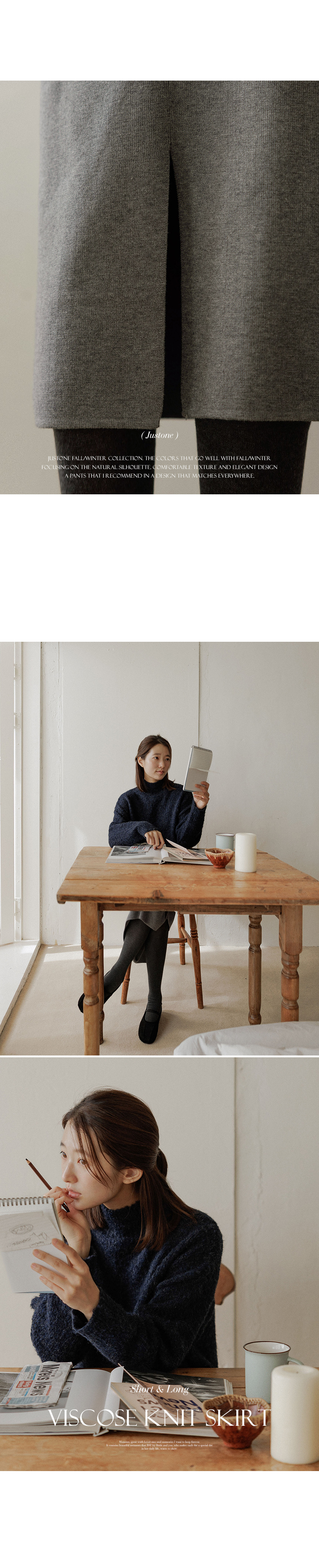 This knit skirt is made of viscose material, so it feels moist and soft to the touch. It has a firm tension, so you can wear it without worrying about stretching. The neat straight fit creates a slim silhouette without making the overall silhouette look bulky!