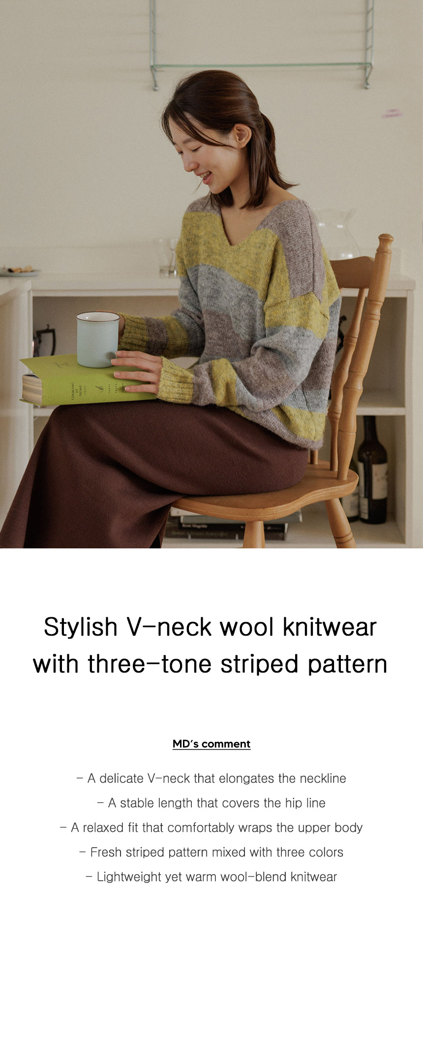 Chic 3-degree striped pattern, pretty V-neck wool knit! The wool blend knit provides excellent heat retention, making it lightweight yet warm. The loose fit makes it comfortable to wear.