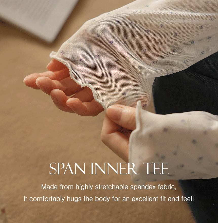 This half-neck T-shirt is made of thin and light spandex fabric with a see-through design, making it perfect for wearing as an inner layer. The soft flower pattern adds a romantic mood, and the wavy lines at the hems add a delicate touch!