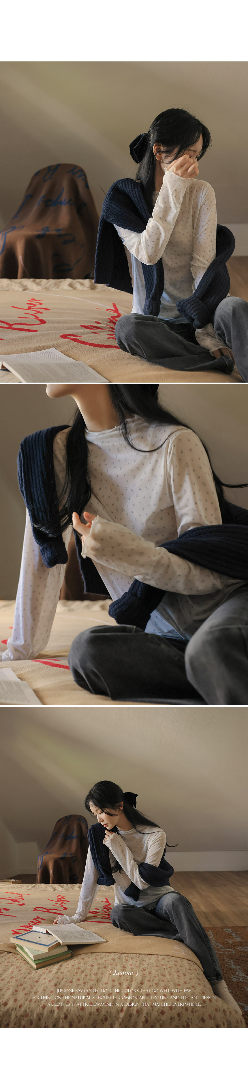 This half-neck T-shirt is made of thin and light spandex fabric with a see-through design, making it perfect for wearing as an inner layer. The soft flower pattern adds a romantic mood, and the wavy lines at the hems add a delicate touch! -