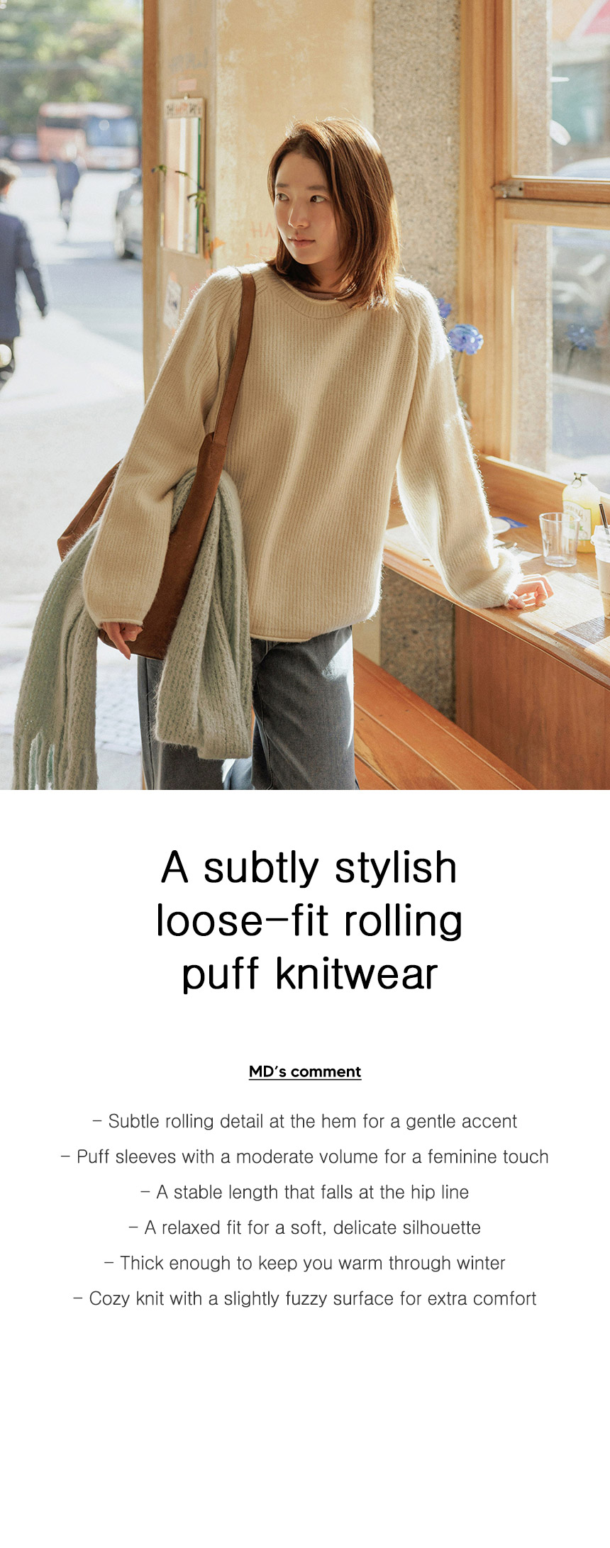 This knitwear features a loose-fit design that drapes softly along the hip line, creating a delicate and relaxed vibe. The puff sleeves, with just the right amount of volume, add a feminine touch.