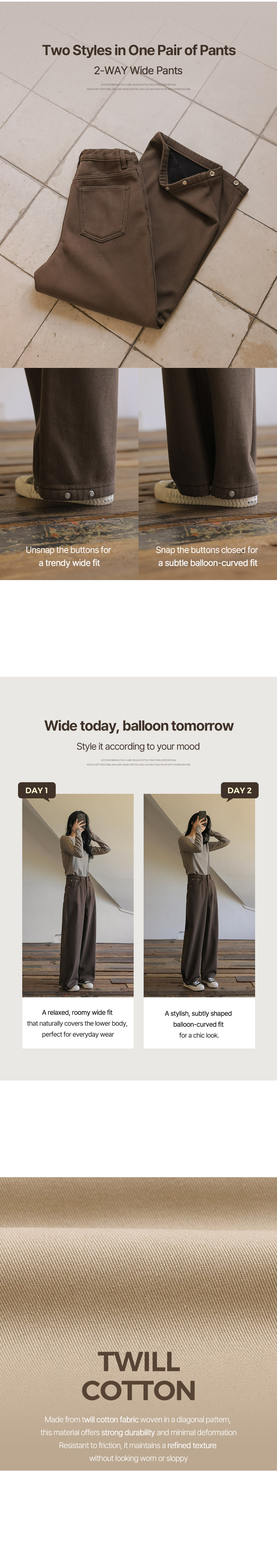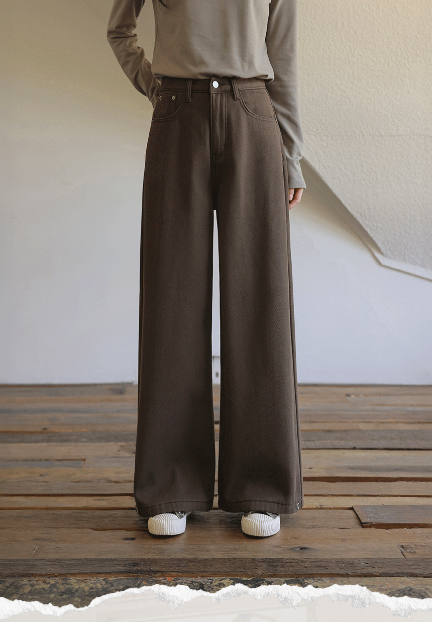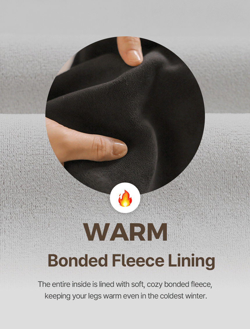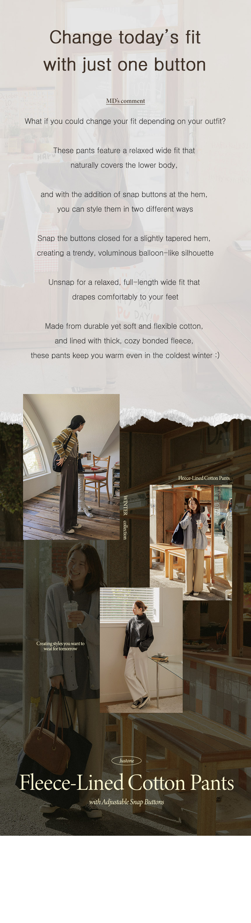 Pants with two styles, one snap button! Wide fit that provides ample coverage and curved fit with a delicate balloon feel. These cotton pants with thick, bonded fleece lining keep you warm and stylish.
