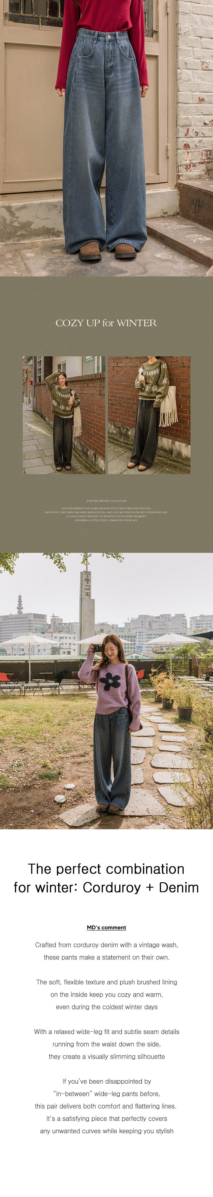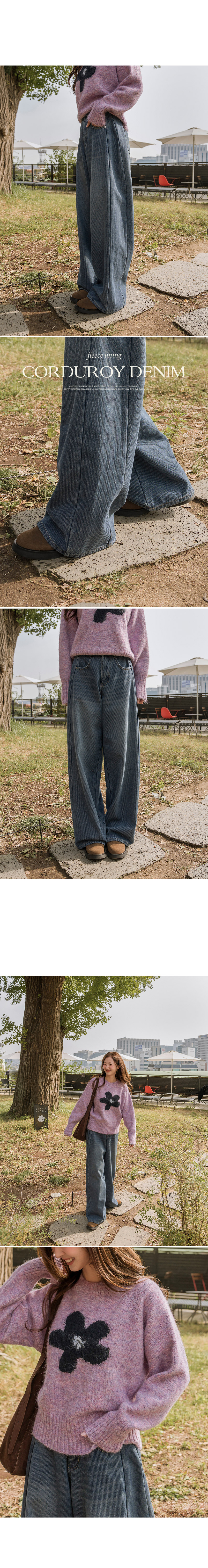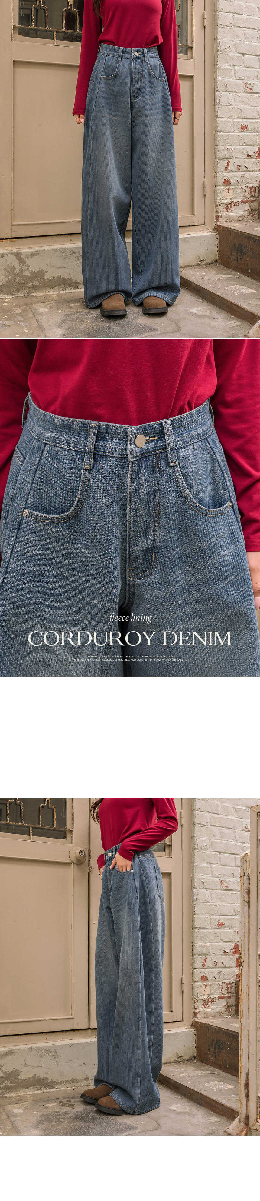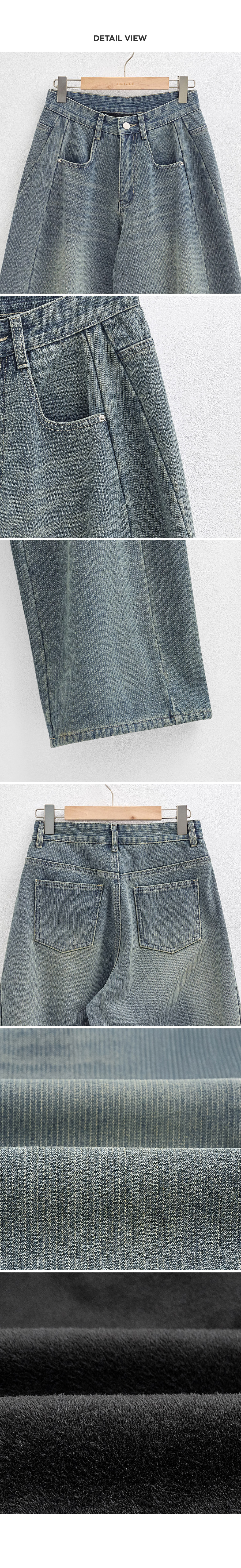 These denim jeans feature subtle pinstripes, giving a corduroy-like look! The wide-fit design flatters your silhouette, while the fleece lining keeps them cozy and comfortable.