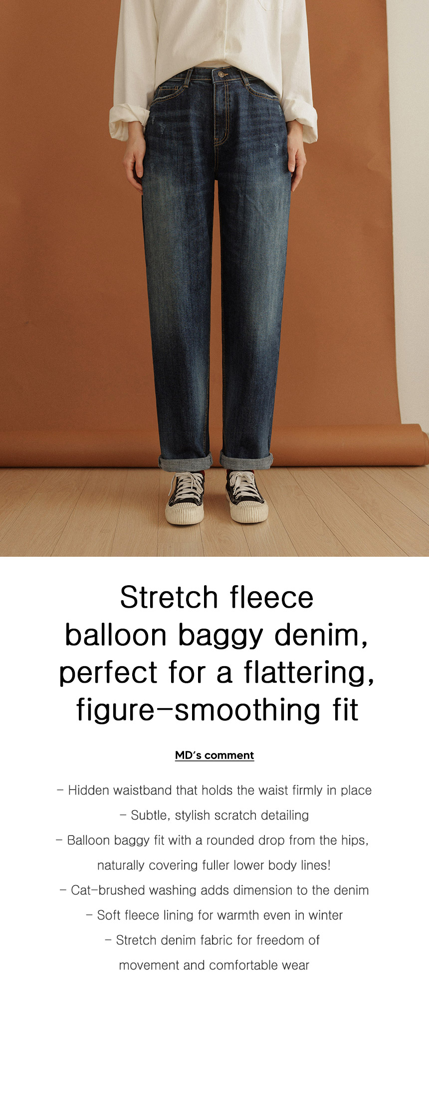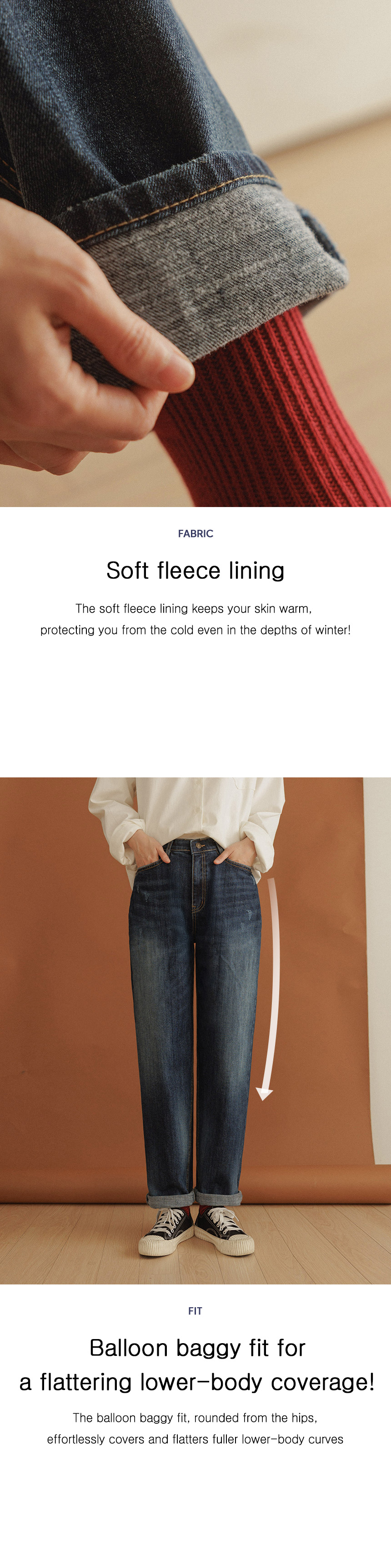 This denim features a balloon baggy fit that falls from the hip line to a rounded shape, naturally covering up any excess fat on the lower body, making you look slimmer! Made with spandex fabric with a soft fleece lining, it's warm and comfortable to wear.