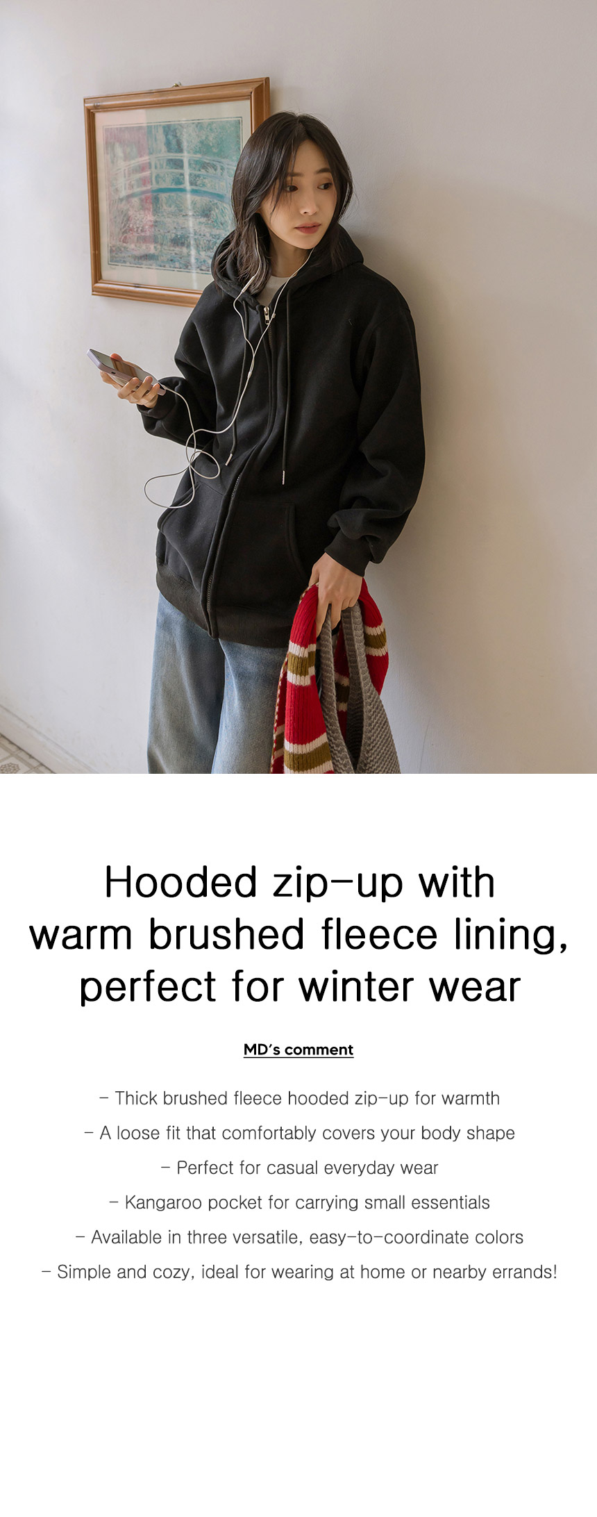This thick, cozy hooded zip-up is perfect for layering as outerwear! Its loose fit comfortably drapes over your body, making it flattering and easy to wear anywhere.