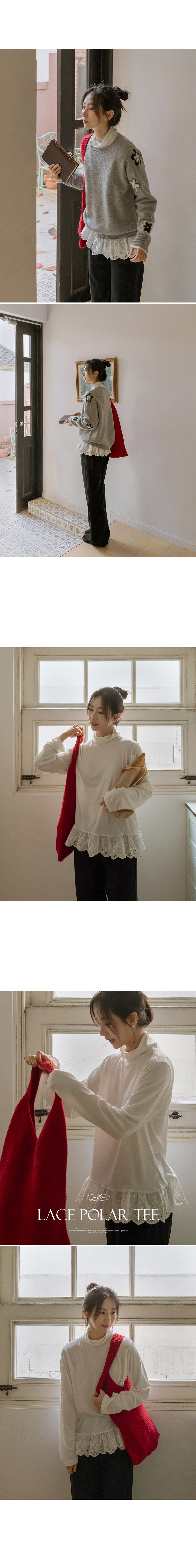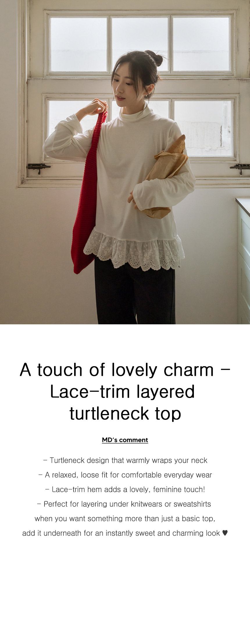 Tired of wearing just a plain knitwear or sweatshirt? This layered turtleneck top with a lace hem adds a feminine and charming touch to your outfit.