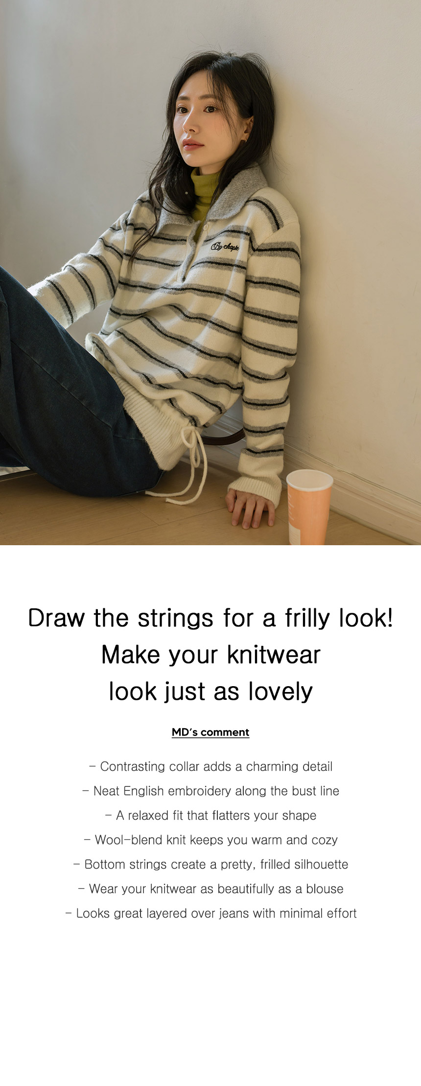 It’s a charming collared knitwear, resembling a blouse with a drawstring hem, featuring subtle stripes and delicate embroidery as decorative details.