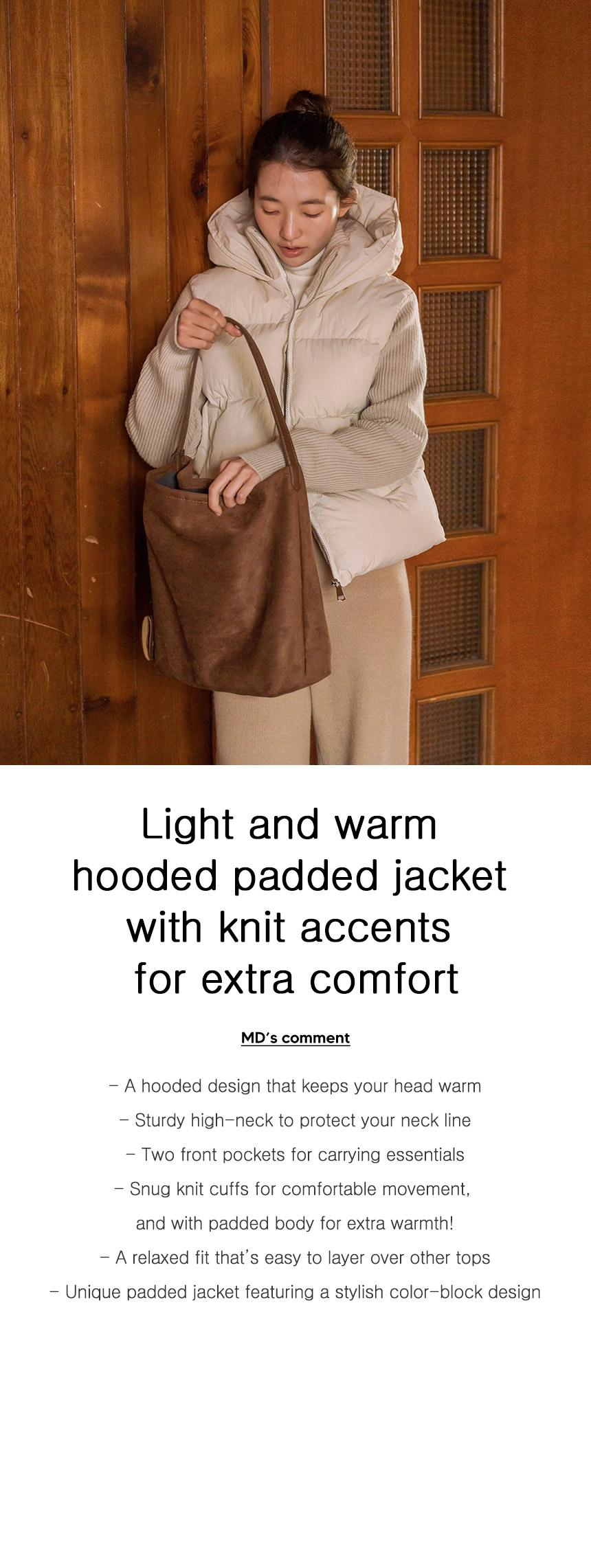 A hooded padded jacket featuring a cozy knit color combination for extra comfort! The hoodie and high neck offer excellent protection against cold winds, while the cotton-filled body adds warmth. The stylish color-block design gives this outerwear a chic, modern look.
