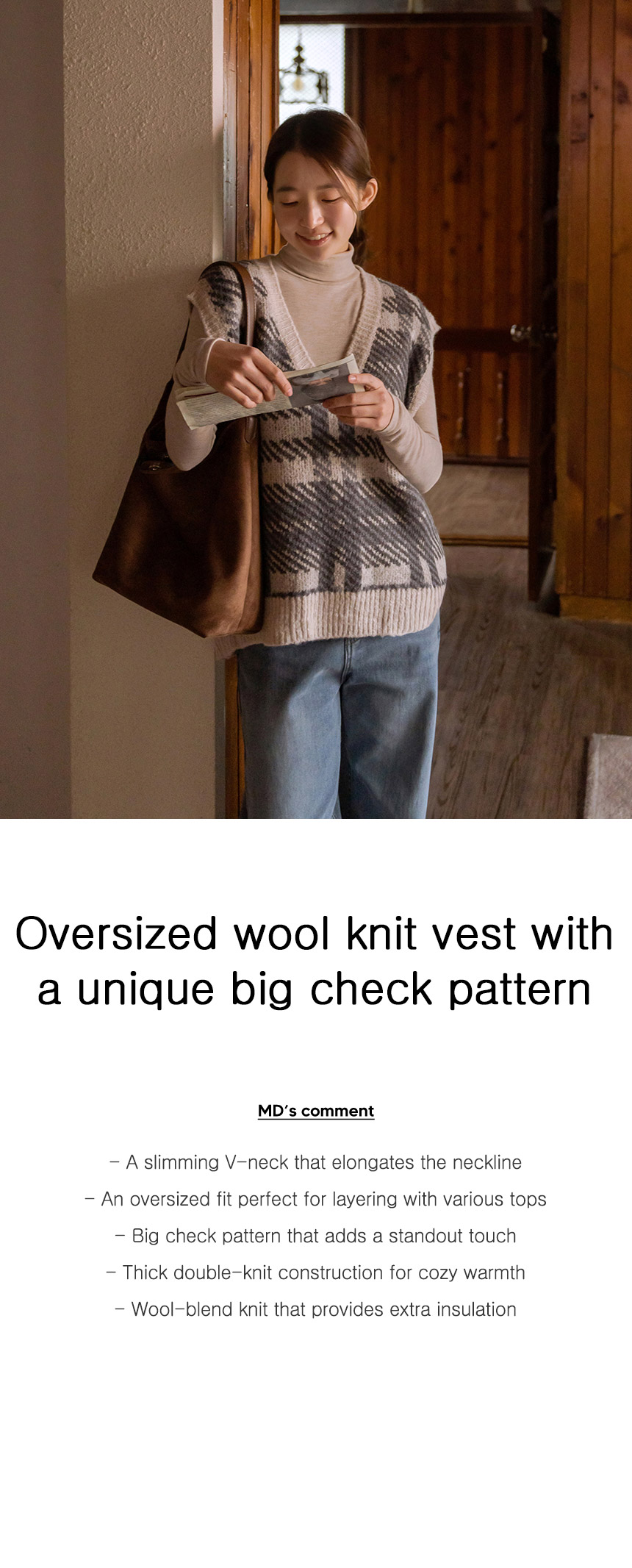 This oversized V-neck knit vest is perfect for layering with a variety of tops! The large checkered pattern adds a unique charm, and the thick, double-knit wool-blend knitwear keeps you warm and cozy.