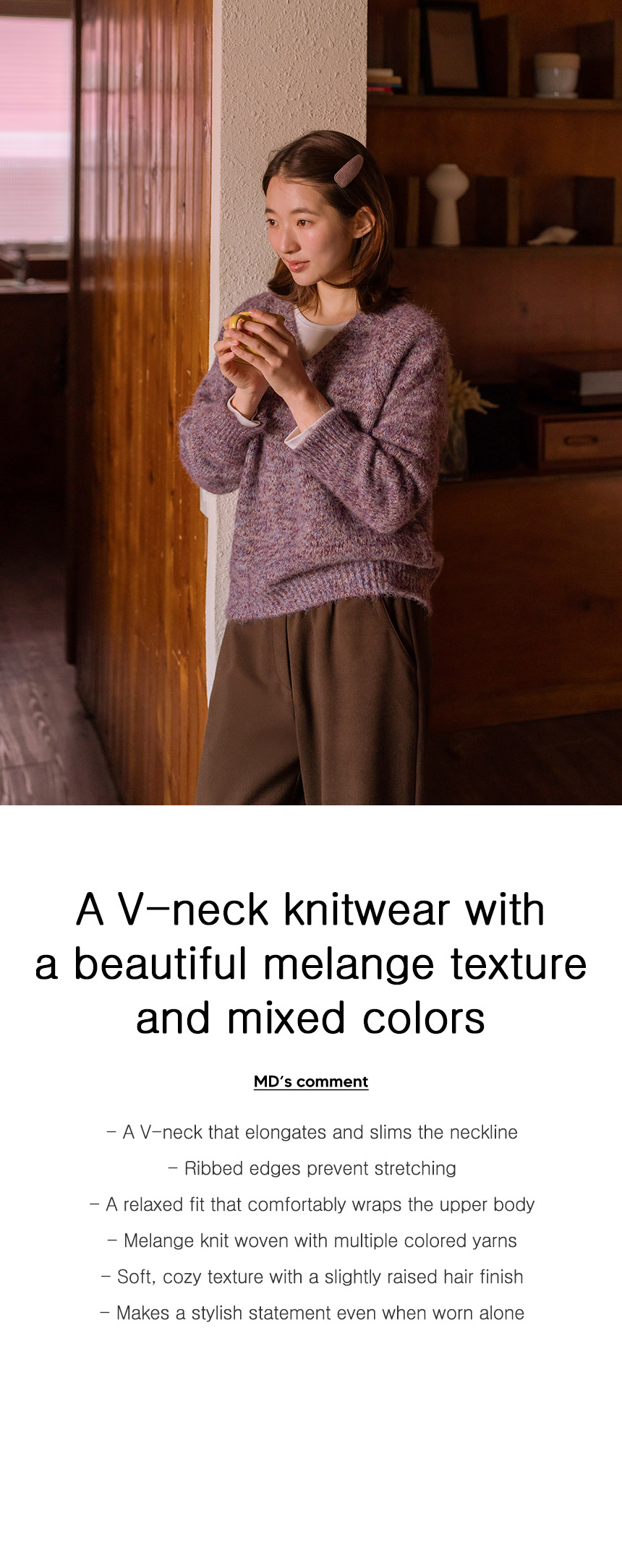 This loose-fit knitwear comfortably wraps around your upper body for all-day comfort. Made with multicolored threads, it’s stylish enough to stand out on its own, even when worn simply as a knitwear!