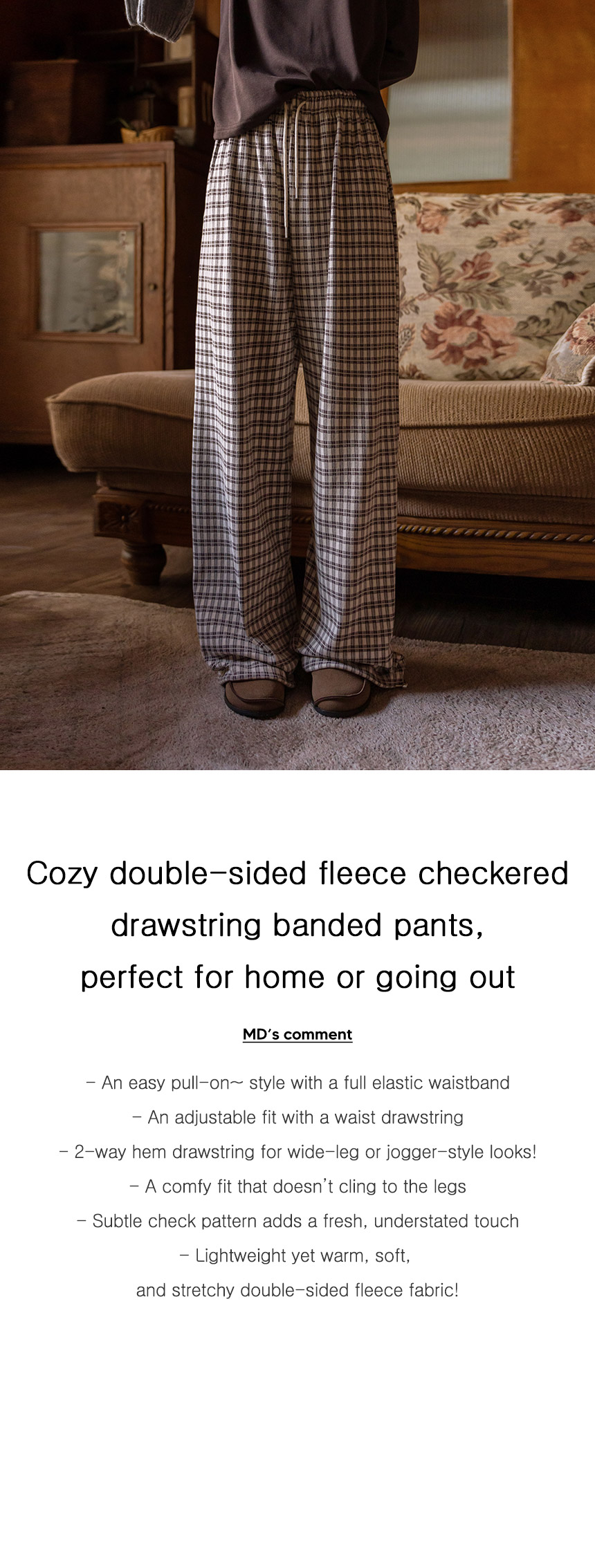 These checkered banding pants are perfect for lounging at home or stepping out! The drawstring waistband lets you adjust the fit, while the soft, stretchy fleece fabric keeps you warm and cozy.