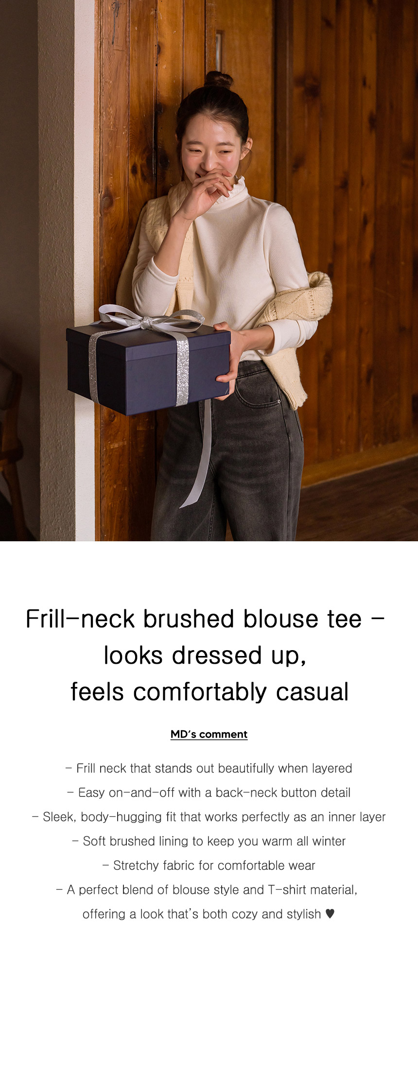 The frill detail on the neckline adds a lovely accent to layered outfits, and the combination of a blouse-like look with comfortable T-shirt material makes this piece both stylish and easy to wear!