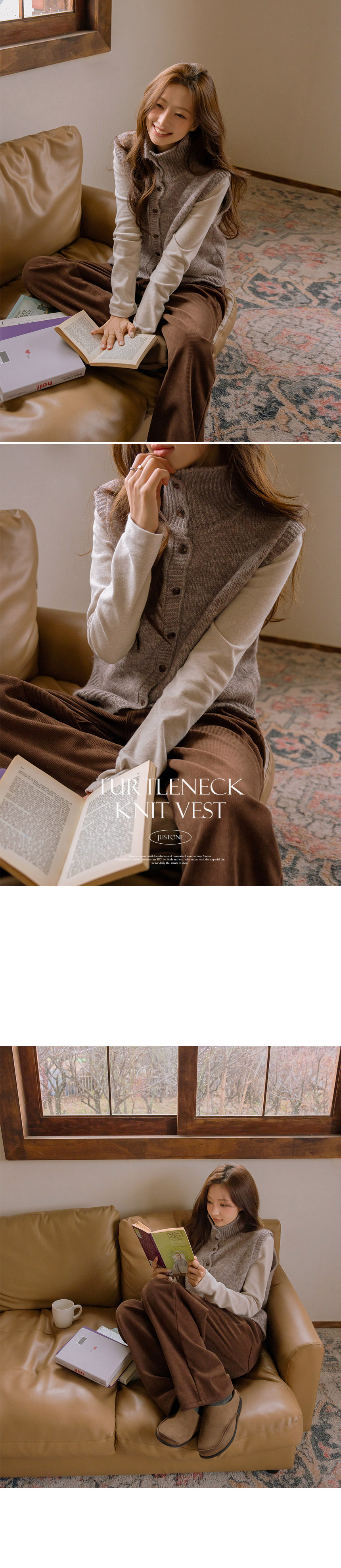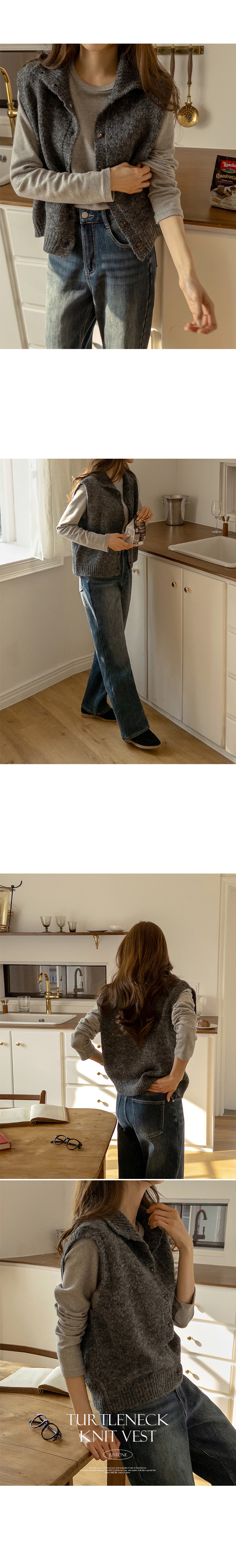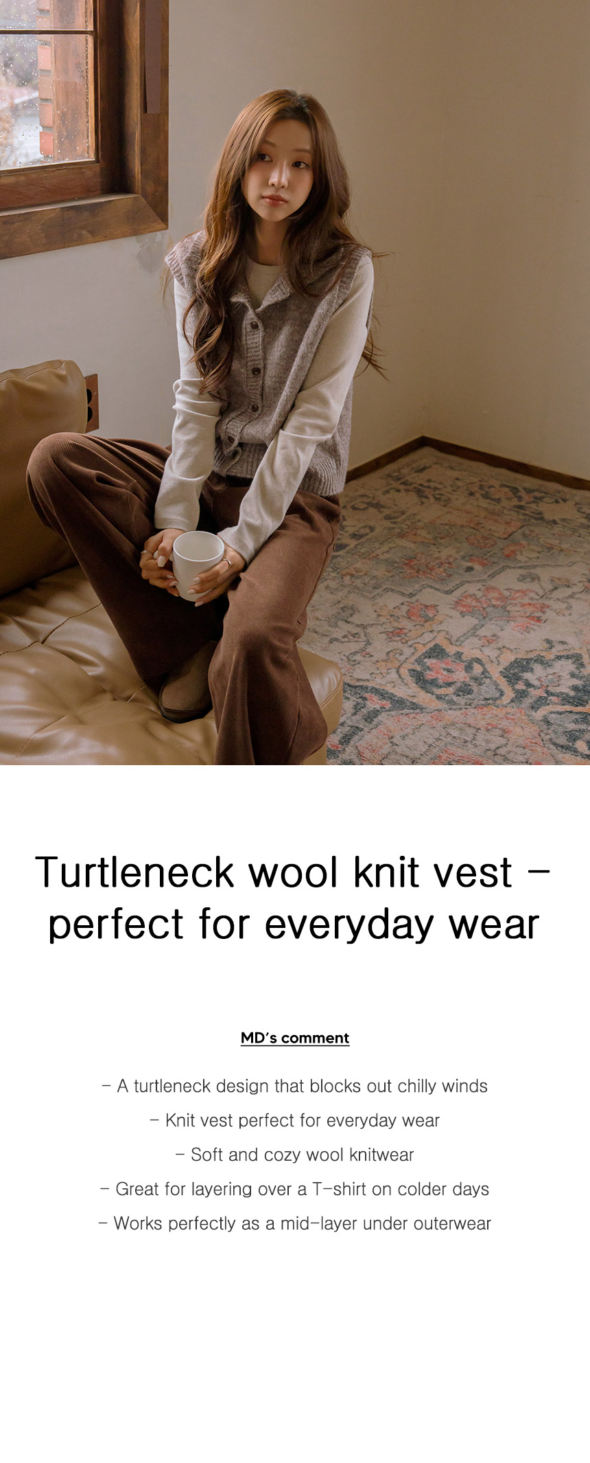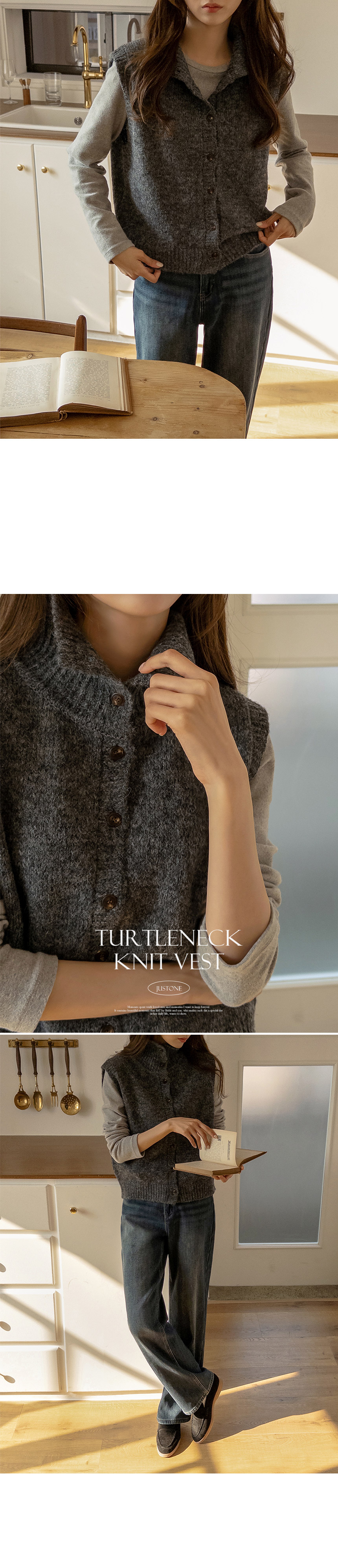 This knit vest can be buttoned up to create a turtleneck look. Its loose-fit design flatters the body shape, making it perfect for wearing over a basic T-shirt.