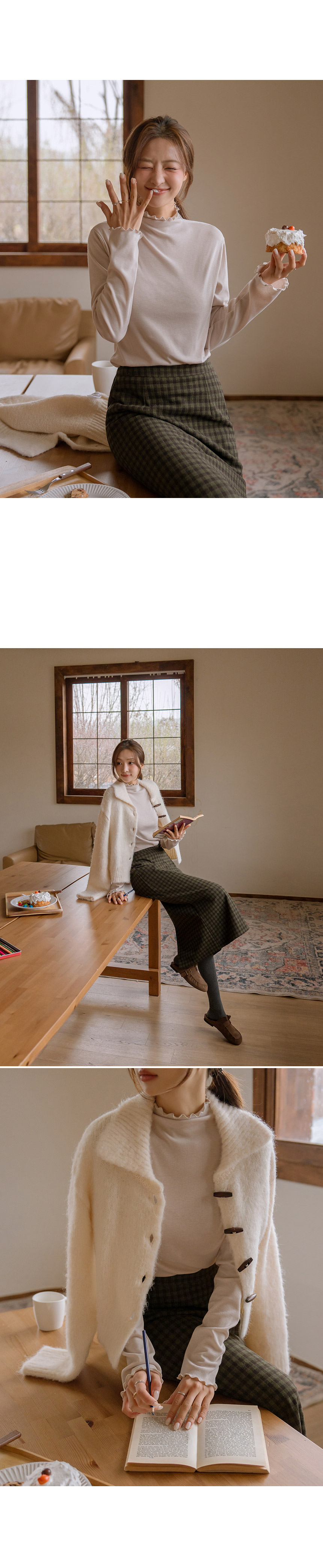 This feminine and pretty tteokbokki button collared cardigan is a great item to pair with a skirt. And the hairy material gives off a cozy feeling!