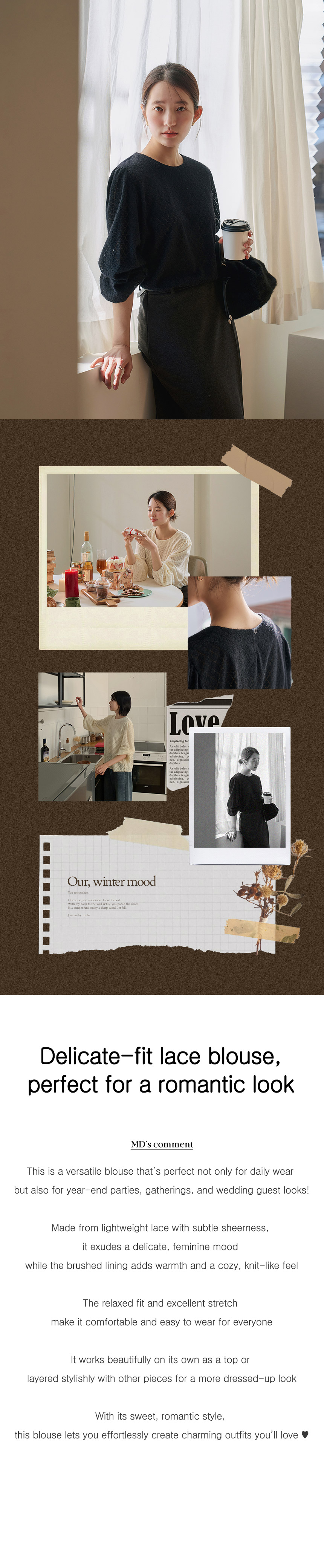 This blouse is perfect for everyday wear, year-end outfits, weddings, and more! The sheer lace fabric exudes a delicate, feminine vibe, while the soft fleece lining keeps you warm like a knitwear.