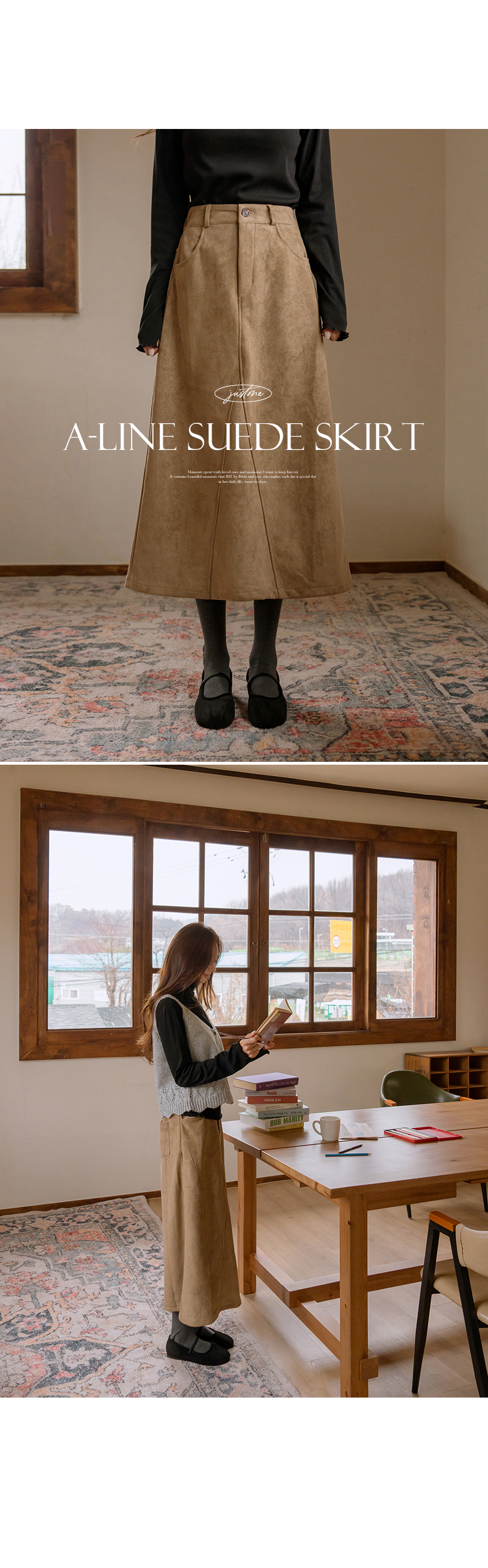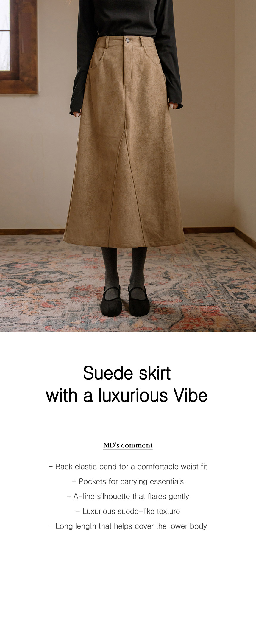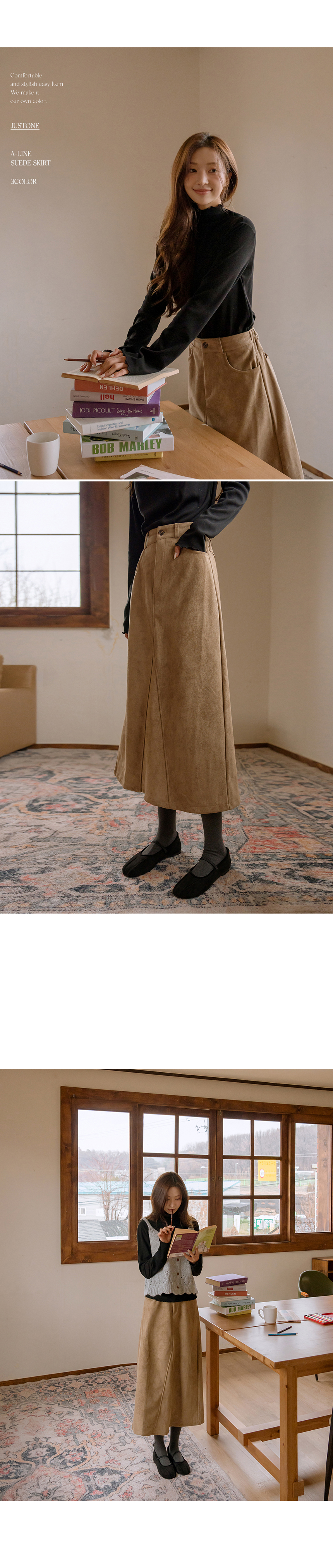 This skirt has a soft suede touch and is comfortable to wear, and its A-line silhouette makes it a great item for daily wear.