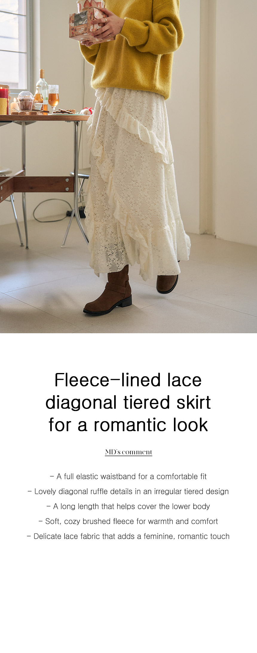 This lace diagonal tiered skirt adds a romantic touch to any outfit! The soft fleece lining keeps you warm against the cold, while the delicate embroidered lace brings an elegant, feminine finish.