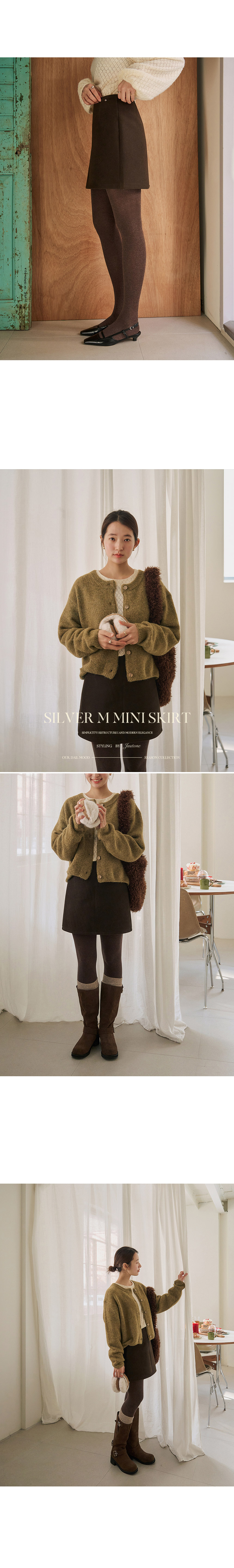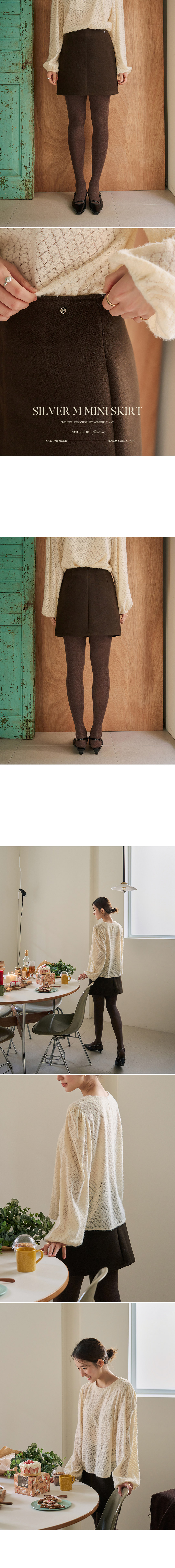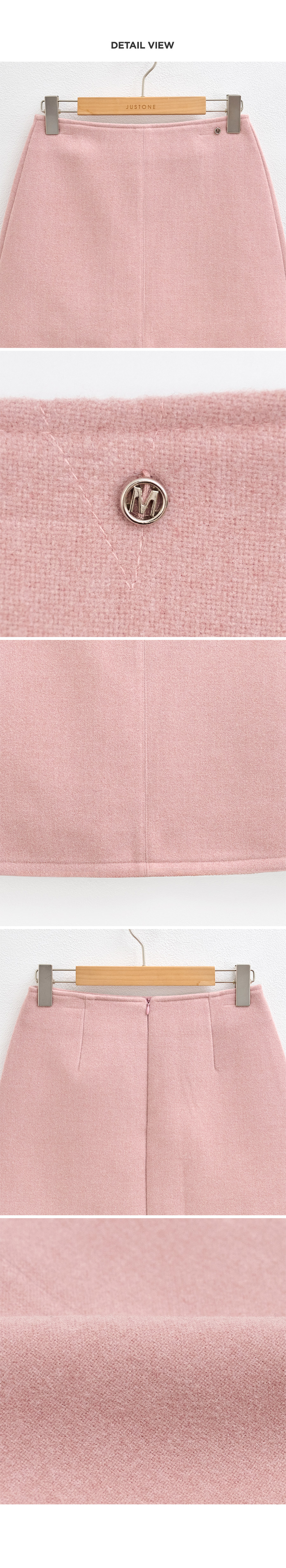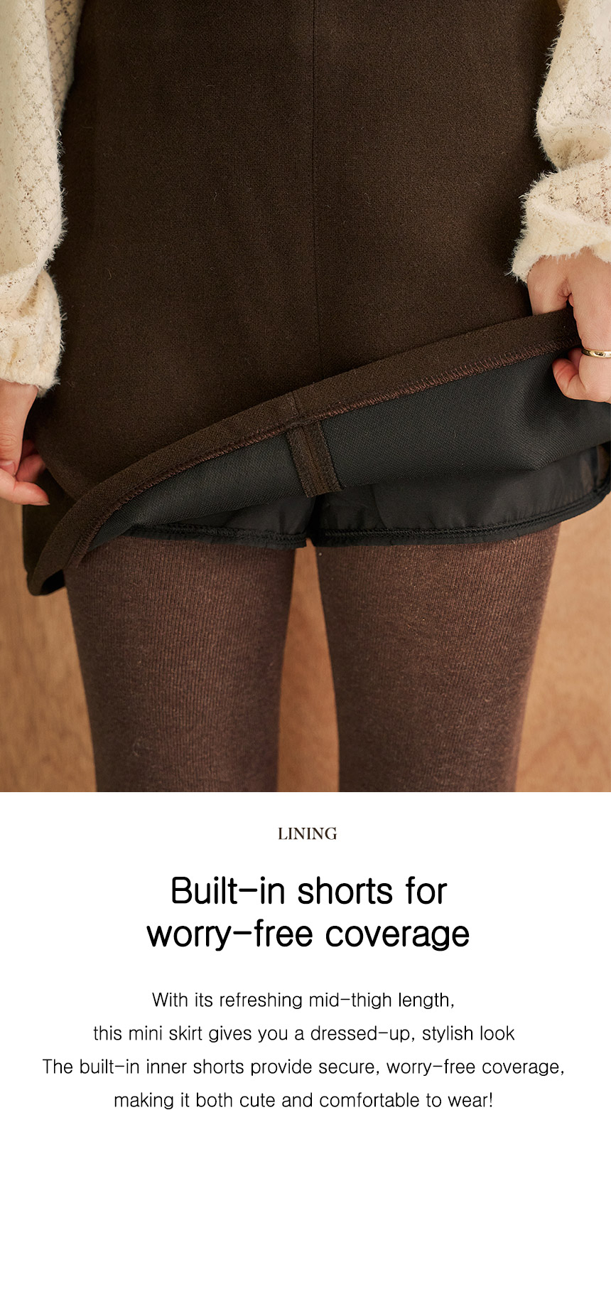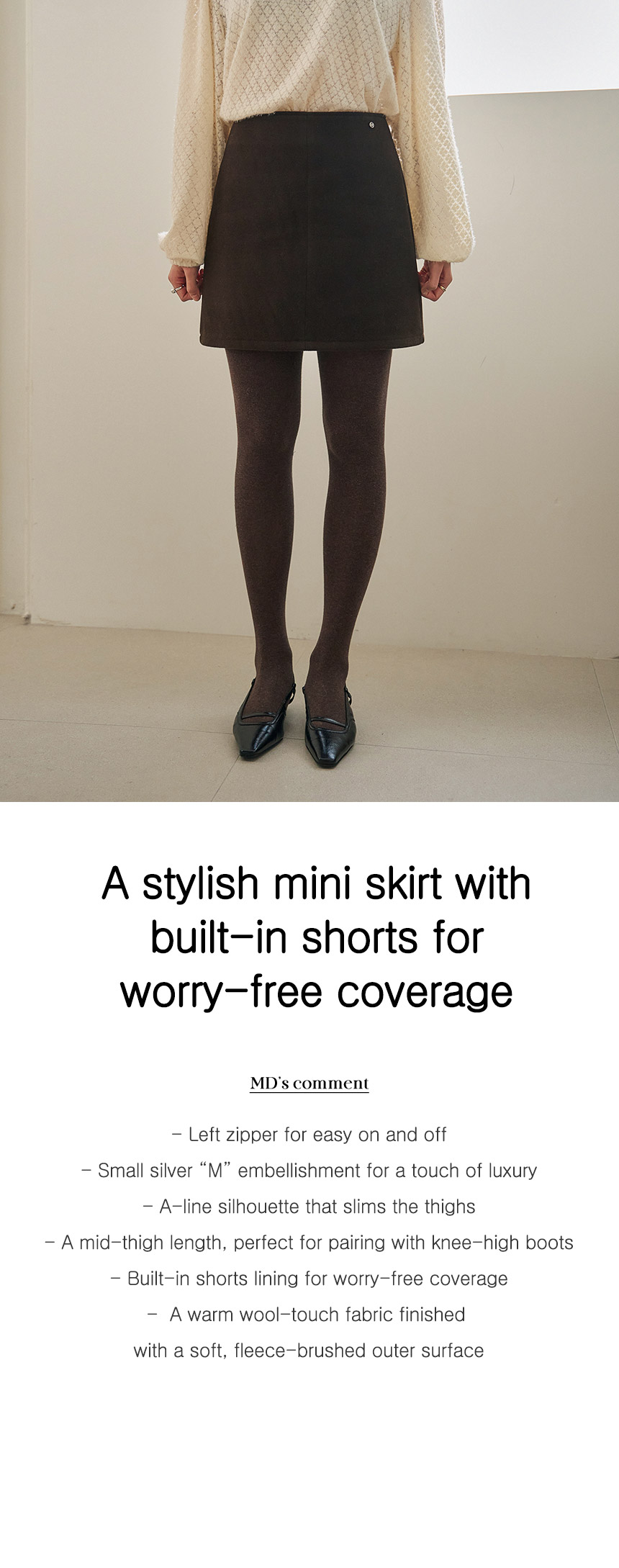 A stylish mid-thigh mini skirt featuring brushed inner shorts for comfortable, worry-free wear. Silver M embellishments add a touch of luxury, while the thick wool-touch fabric keeps you cozy and warm throughout the winter.