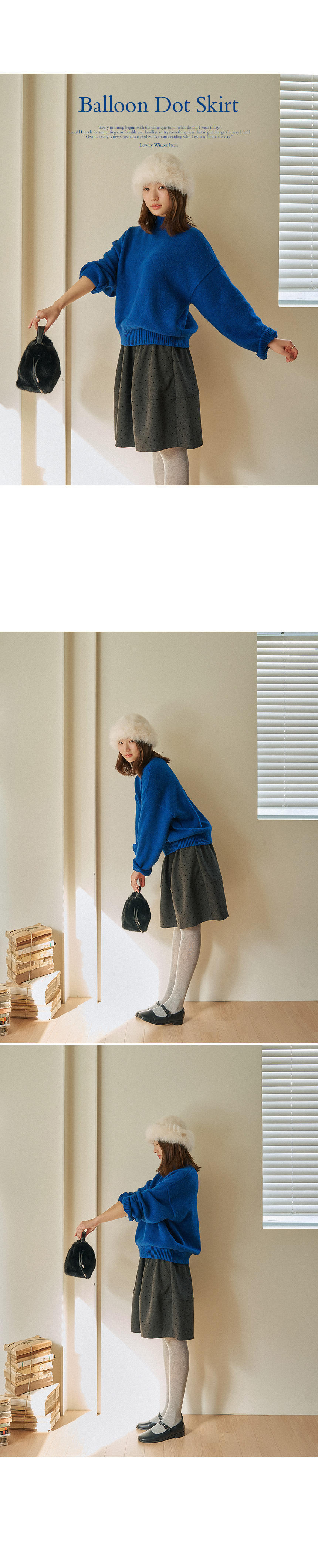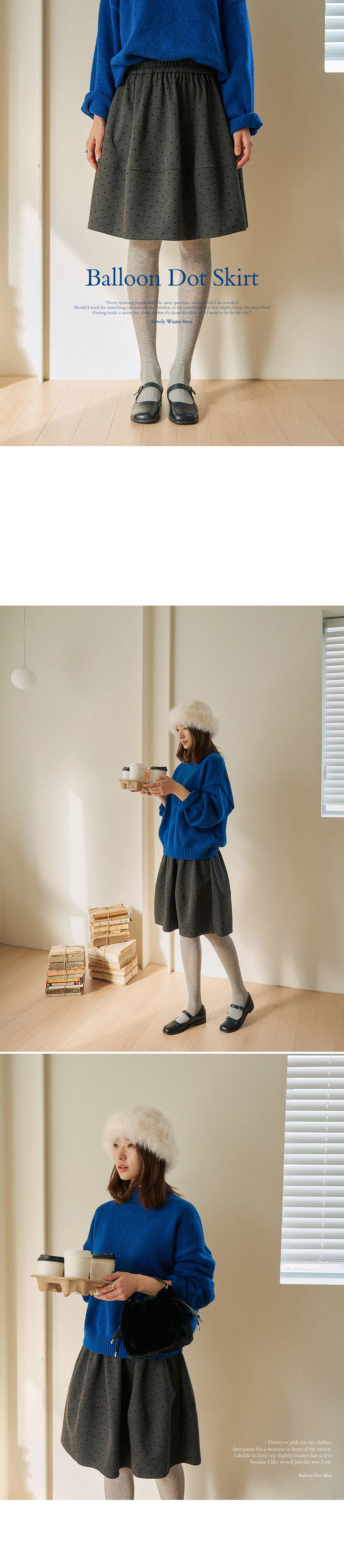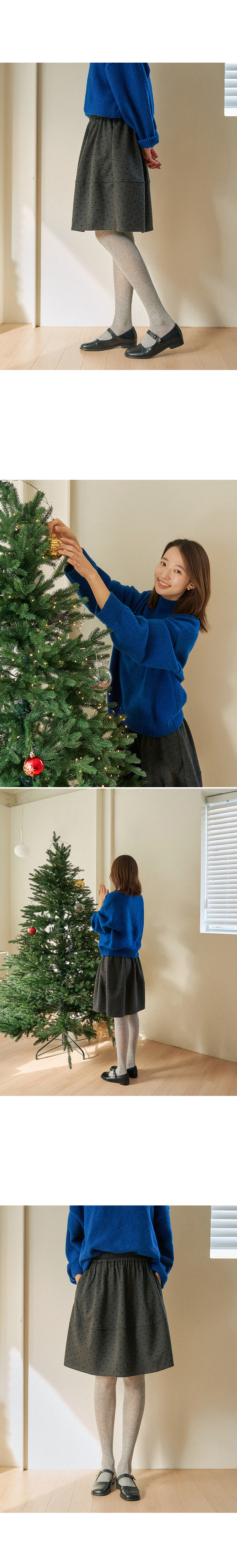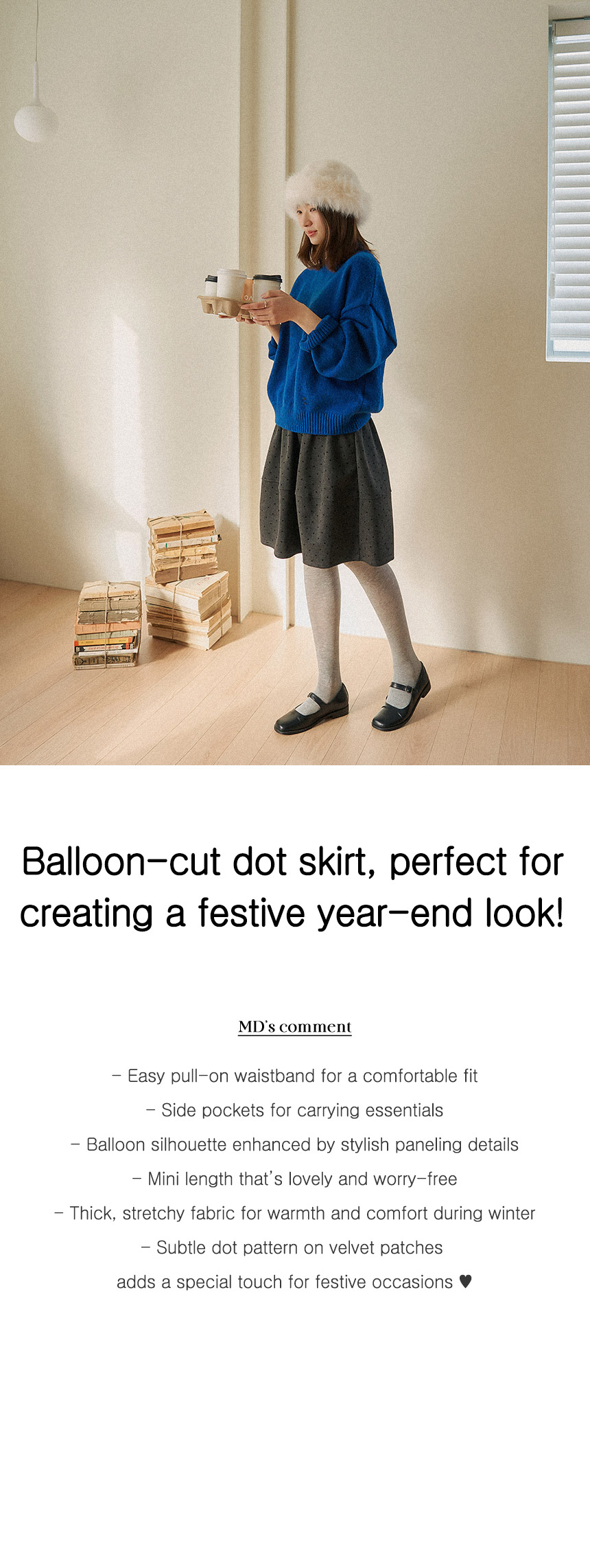 This avant-garde balloon-line skirt is perfect for end-of-year celebrations! The comfortable length provides modest coverage, while the dot pattern on the velvet panels adds a charming and distinctive touch.