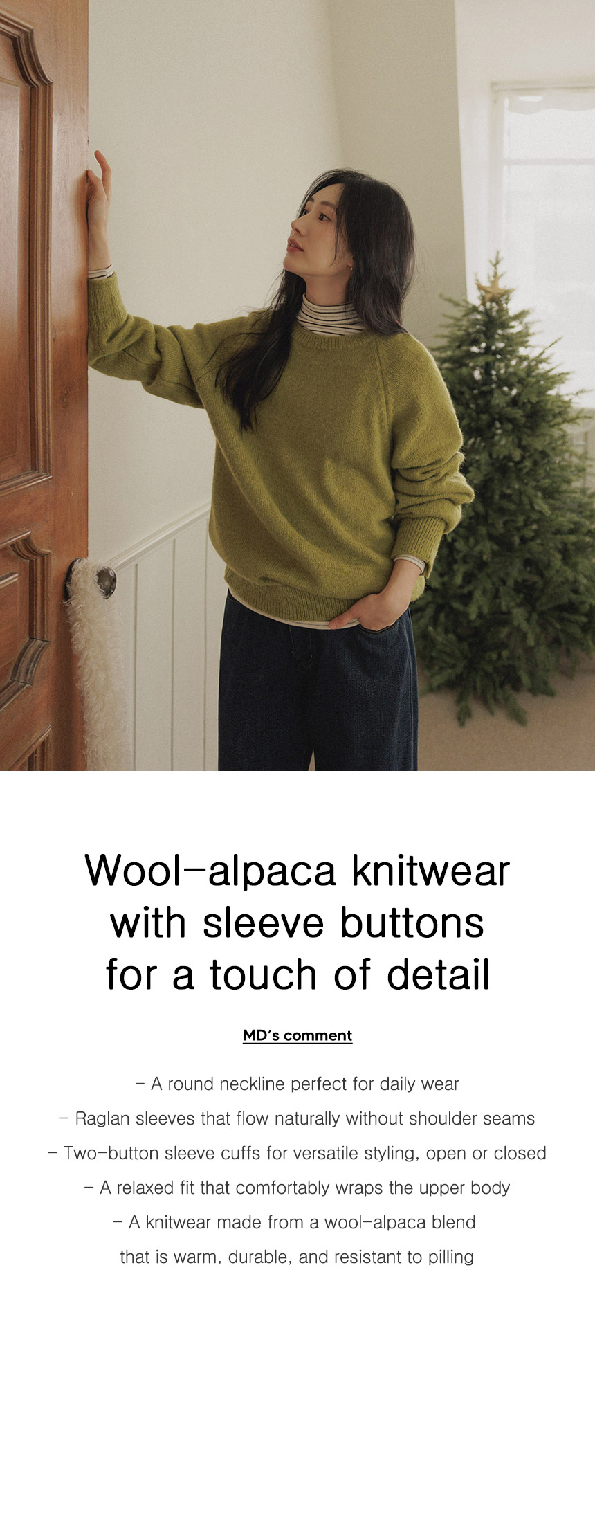 This is a knitwear with a touch of flair at the fingertips! The two-button cuffs allow for easy opening and closing, allowing you to style it however you like. The blend of wool and alpaca ensures durability and excellent heat retention.