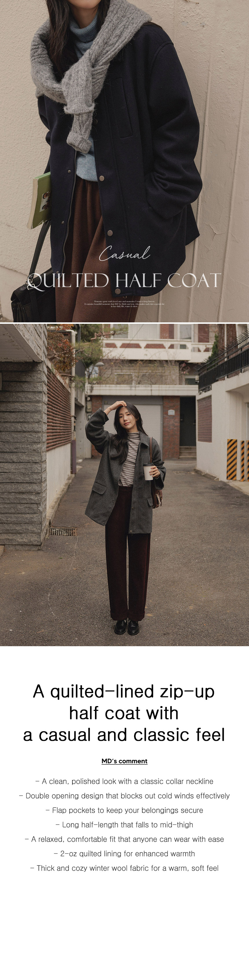 This outerwear features a half-coat, zip-up design that strikes the perfect balance between casual and classic. The 2-ounce quilted lining enhances warmth, while the long half-length provides a cozy, snug fit!