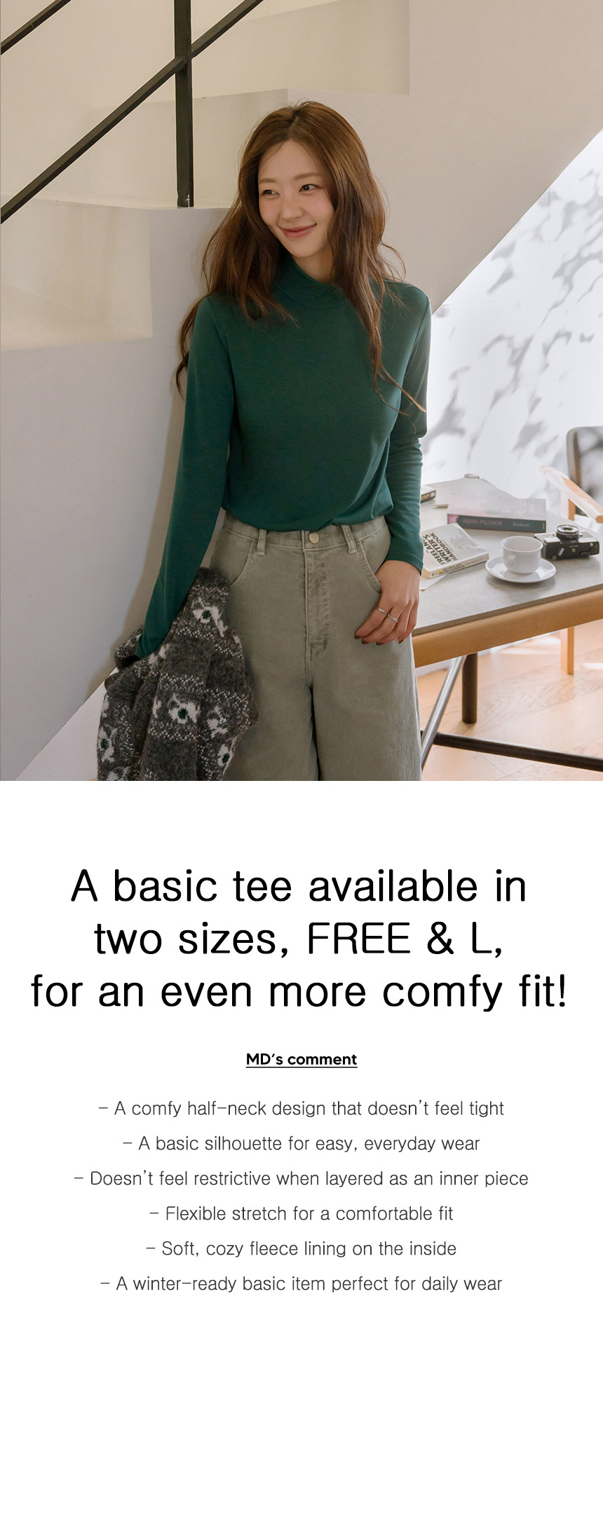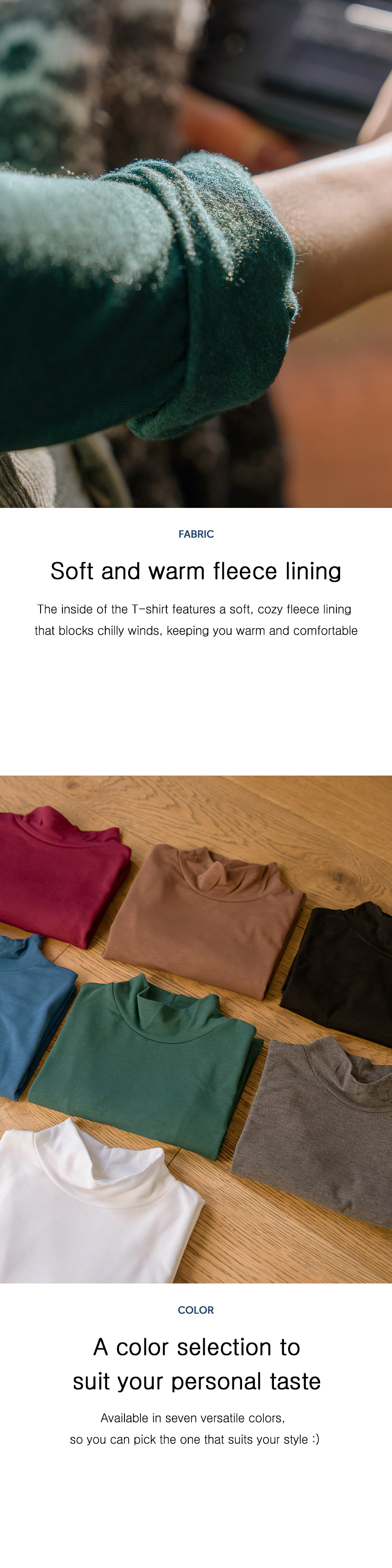 This half-neck T-shirt is available in two sizes for a comfortable fit. The soft, cozy fleece lining keeps you warm throughout the winter.