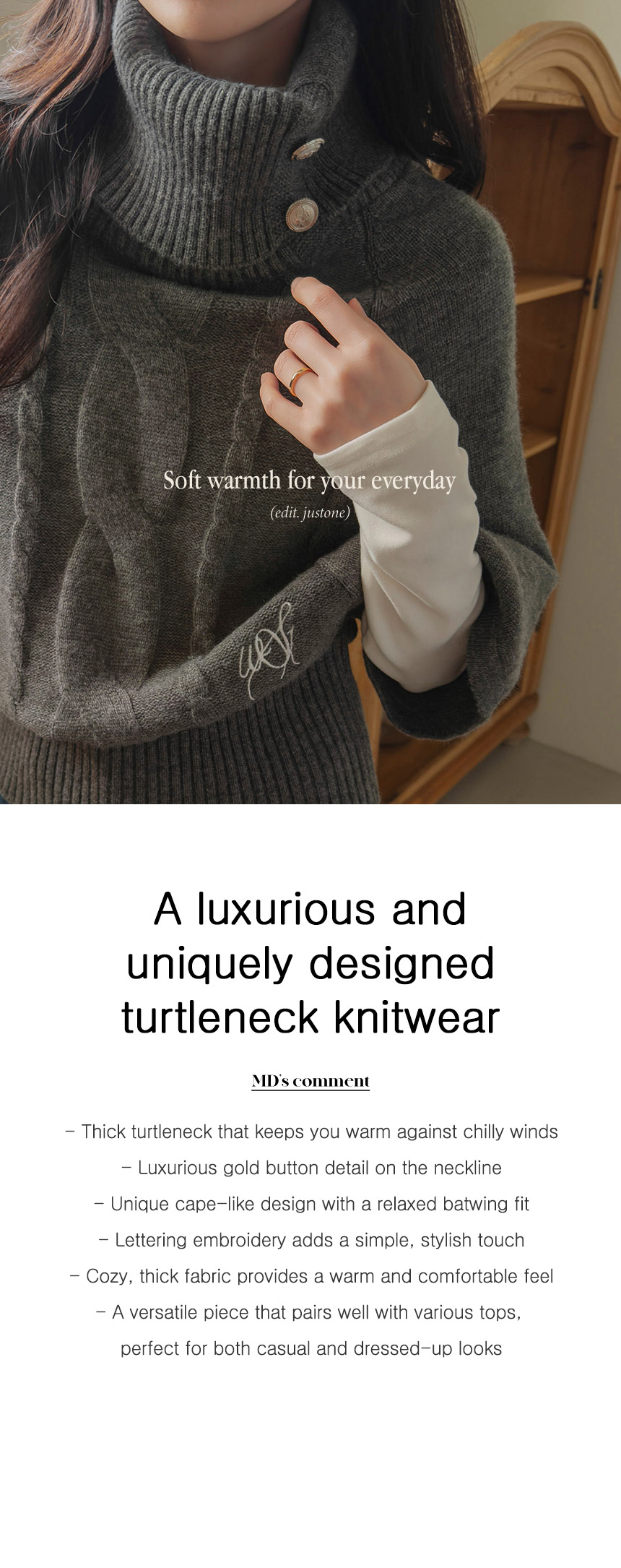 This knitwear features a unique design! The chunky turtleneck keeps you cozy, while the gold button accents add a touch of luxury. Its relaxed dolman fit ensures all-day comfort.