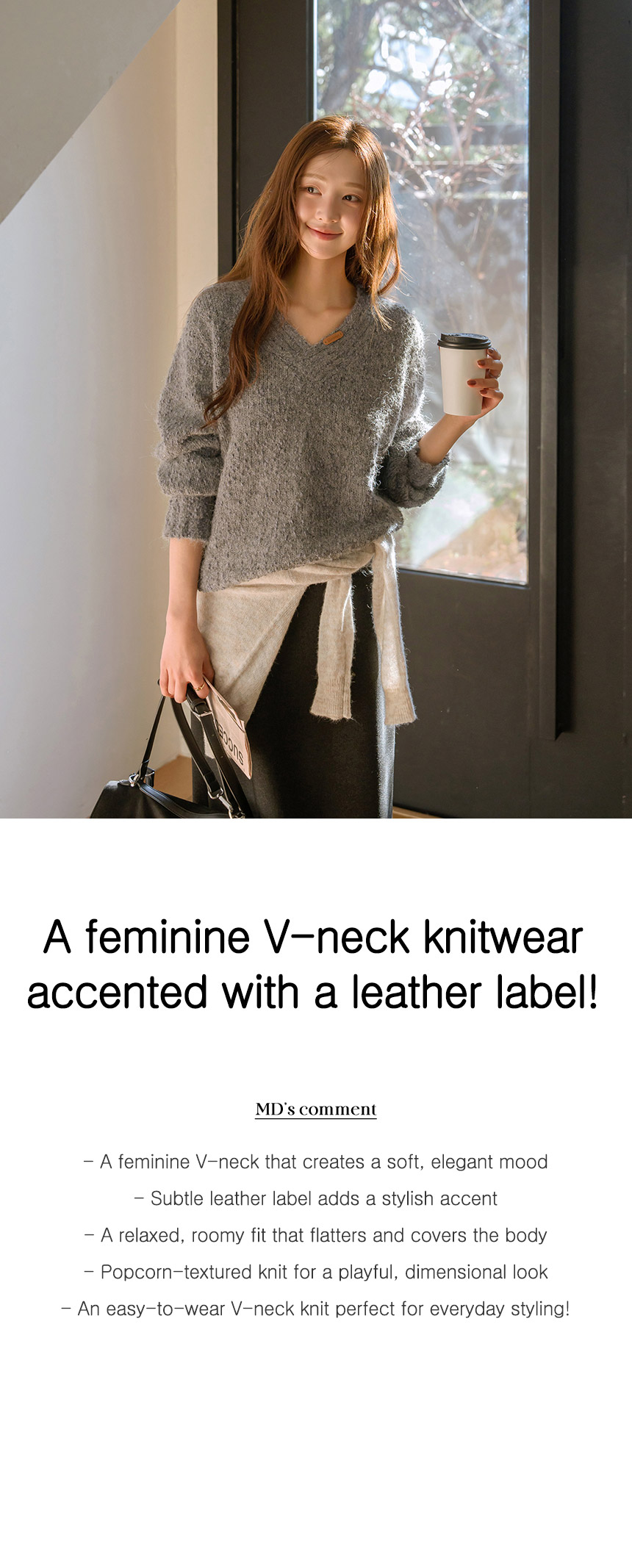 This knitwear features a V-neck design that makes your neckline look pretty and a leather label as a focal point. It's made of fluffy boucle material, making it a warm and comfortable item!