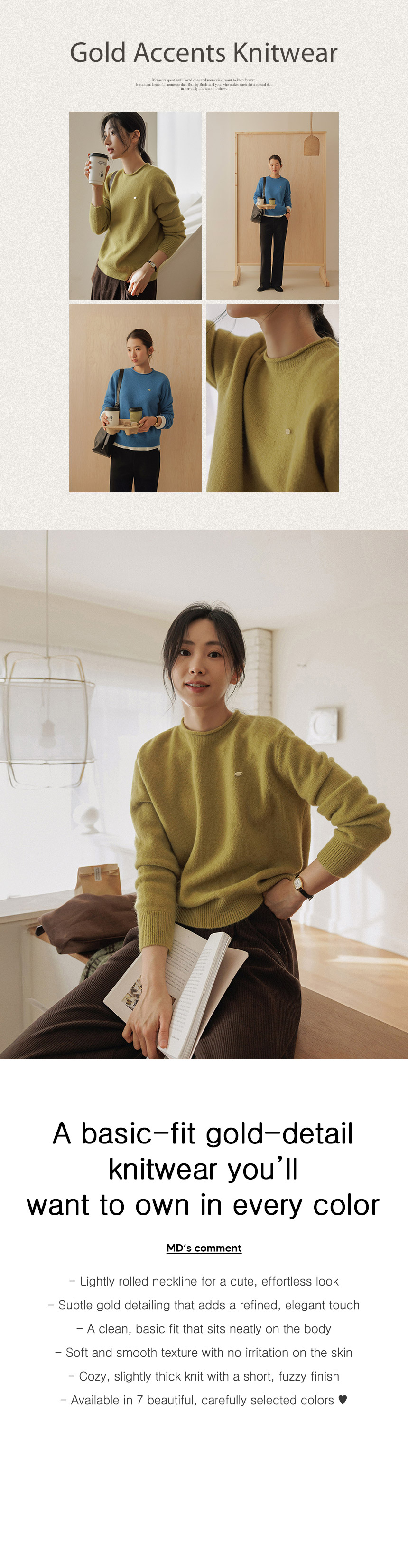 This item is a basic-fit knitwear that is worn neatly on the body, and has a round neck and gold decorations for a subtle touch. It comes in 7 bright colors for your different stylish look ♥