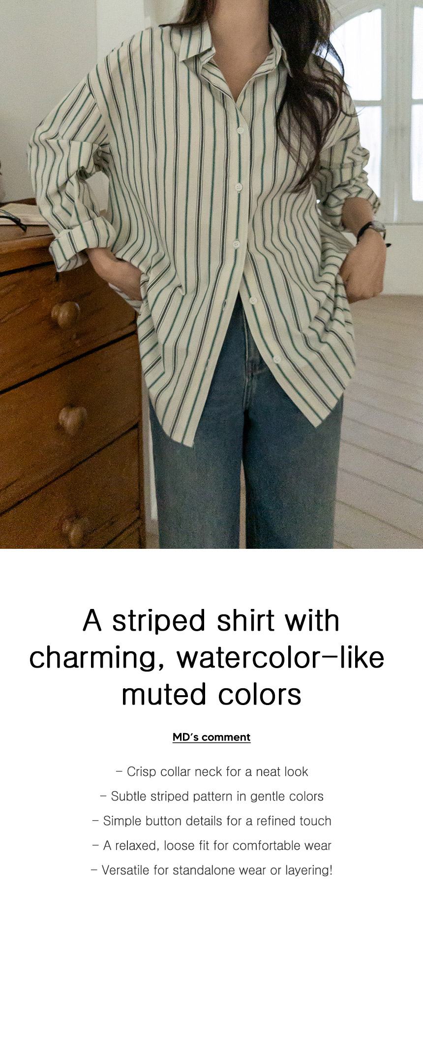 This striped shirt features a relaxed fit that comfortably drapes over the body. Its simple, palette-inspired colors make it versatile - perfect to wear on its own or layered under jackets, outerwear, or knitwear.
