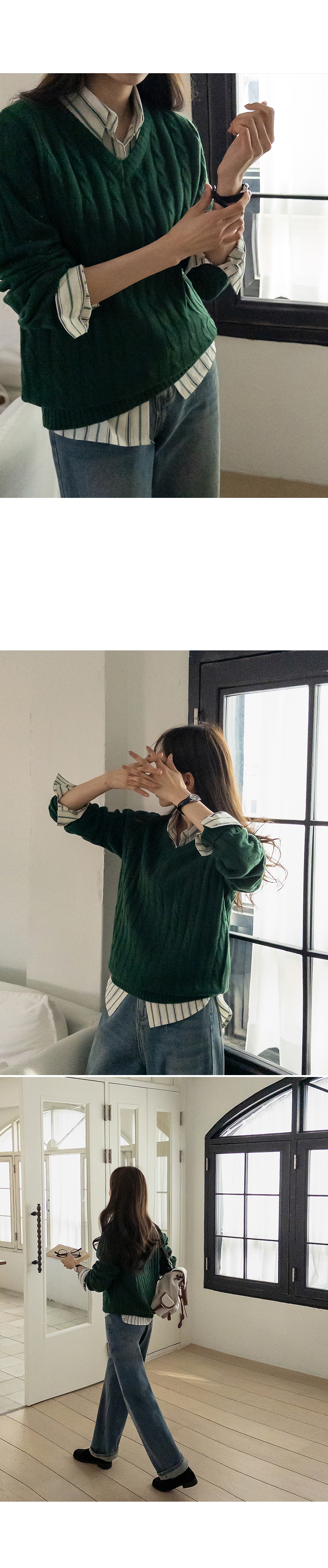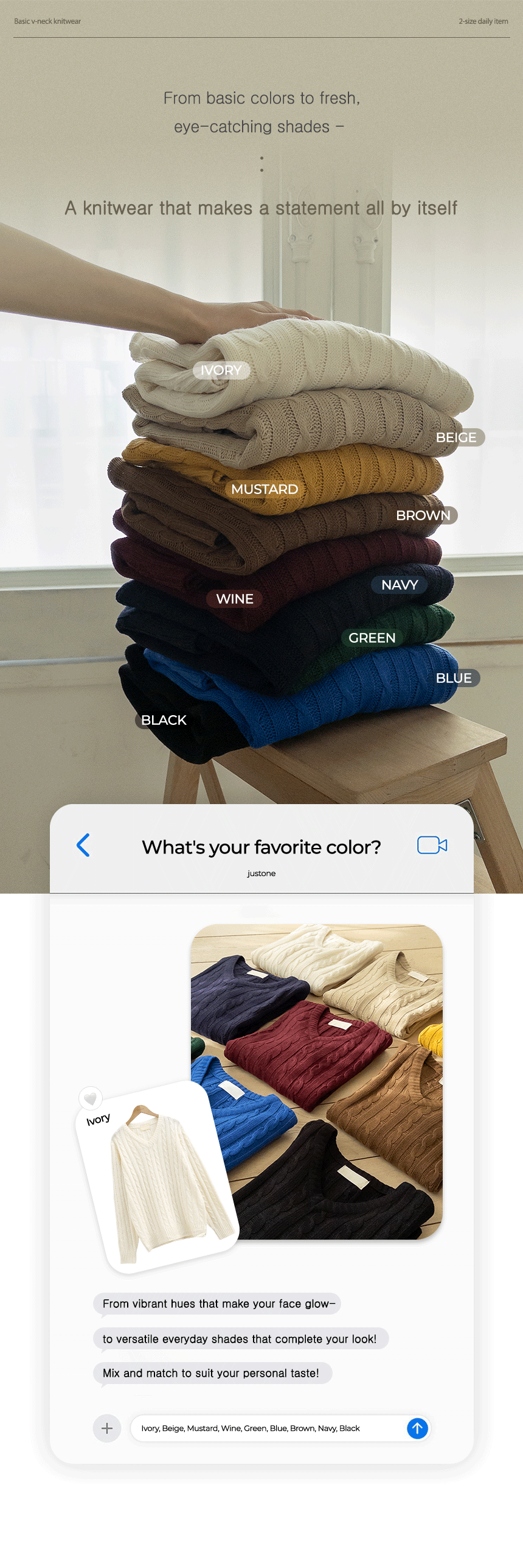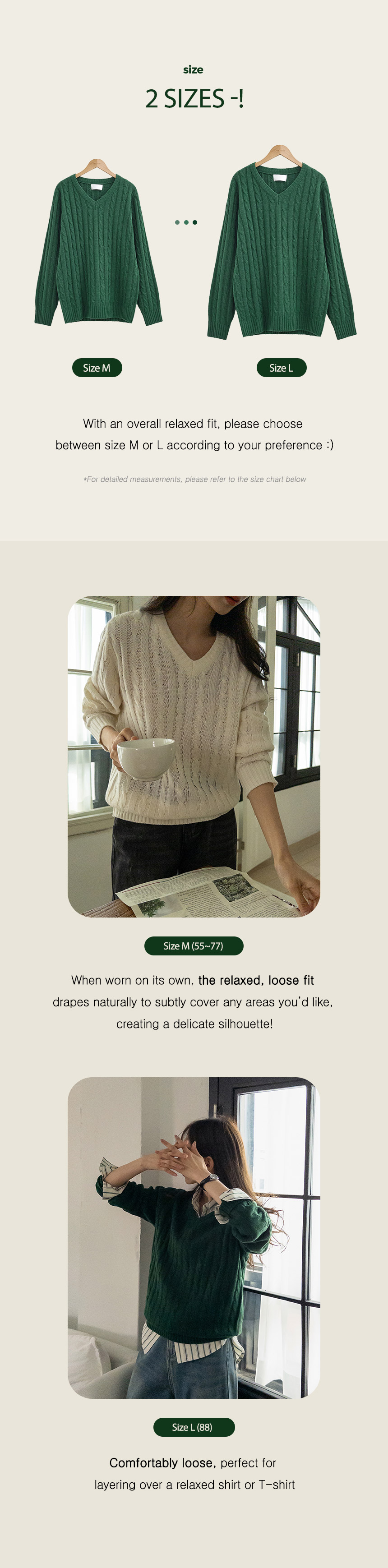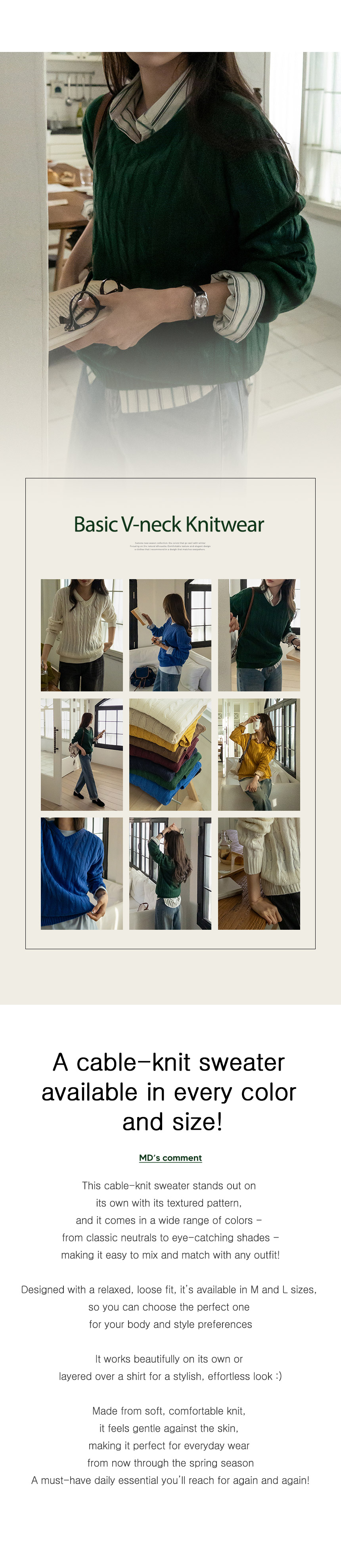 This is two-size cable V-neck knitwear, available in two sizes, can be worn as an inner T-shirt. It has a basic design, so it can be used for daily wear as well as work wear. :)