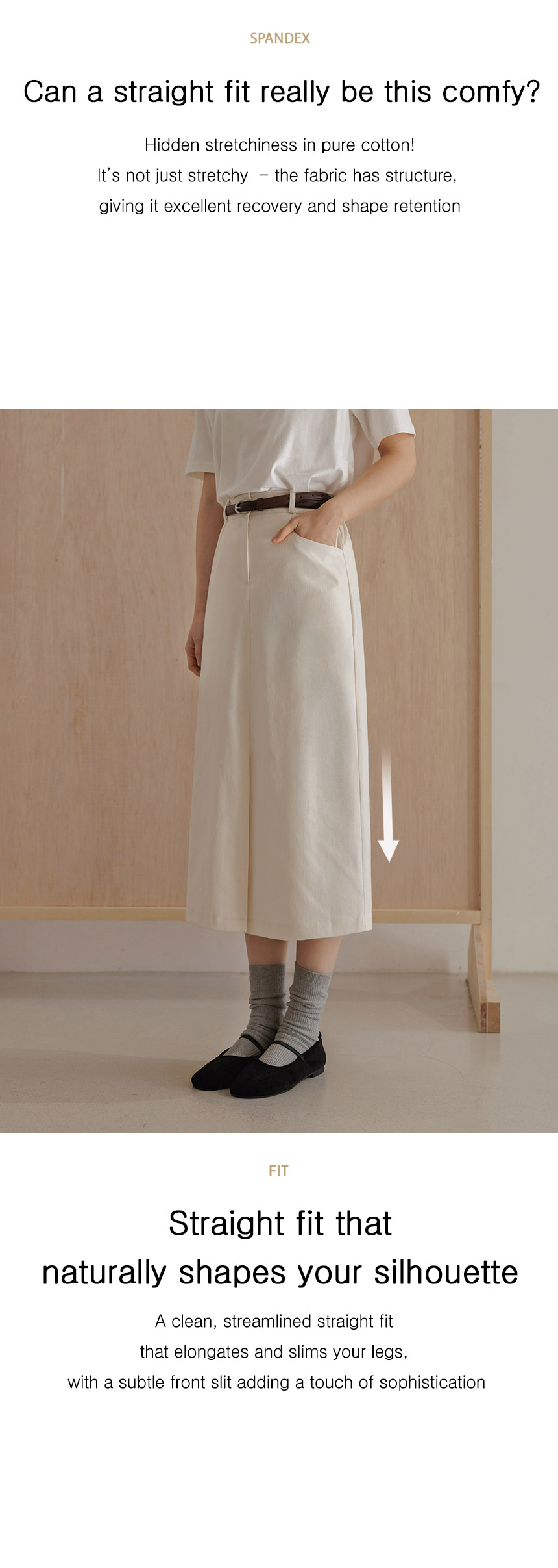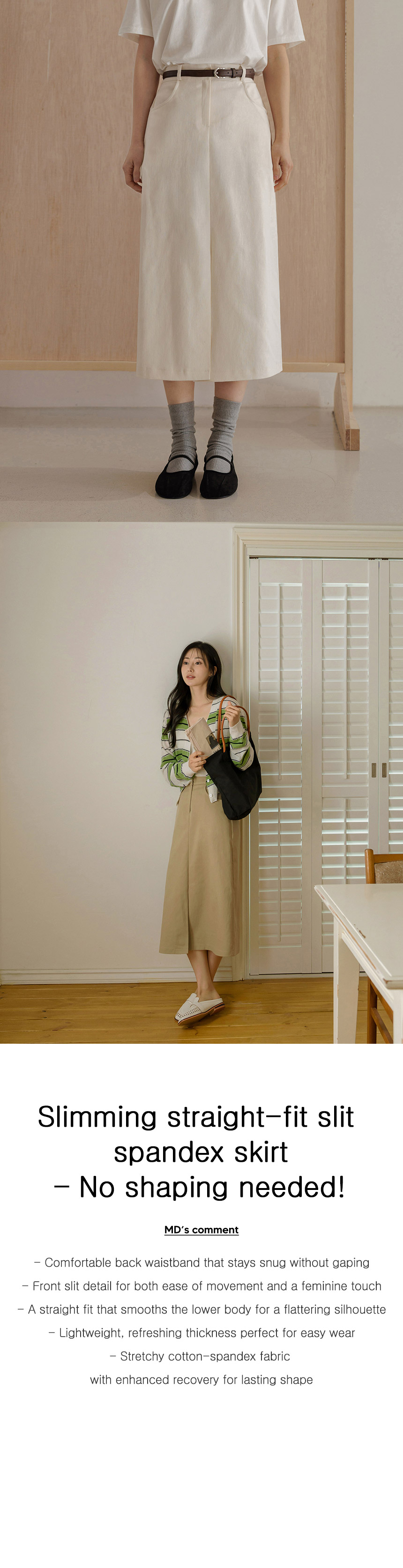 This simple cotton spandex skirt smooths the hip line for an instantly slimmer look. The front slit adds comfort and ease of movement, combining practicality with a feminine touch.