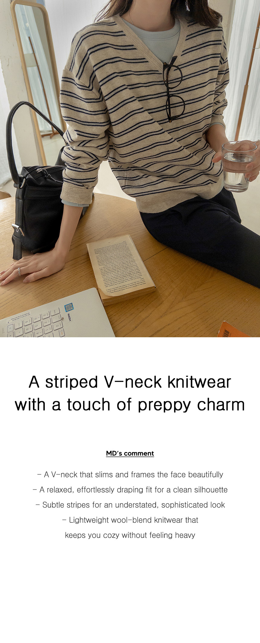 This knitwear features a subtle yet elegant stripe pattern for a preppy vibe! The V-neckline helps create a slimmer look for the face, while the relaxed fit makes it easy and comfortable to wear.