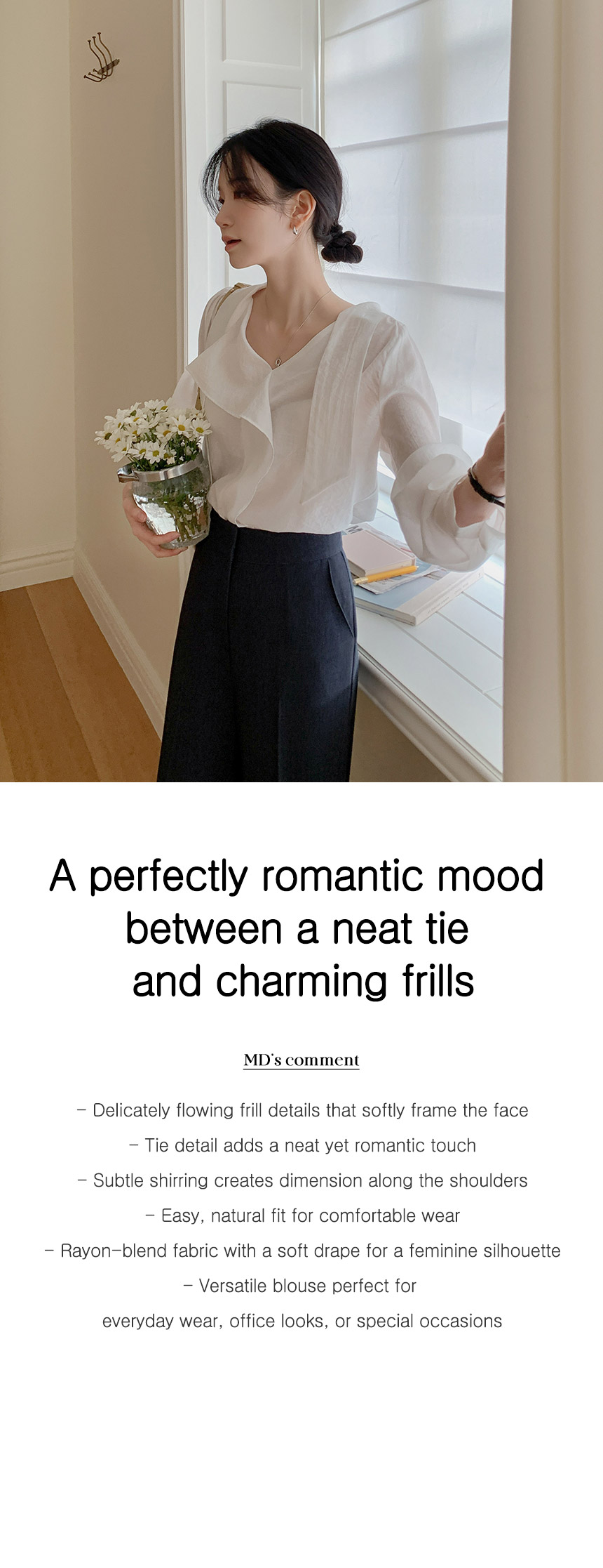 This blouse creates a romantic mood with frill details that highlight the face and a tie design. Its lovely yet feminine style makes it a versatile piece that works beautifully with a variety of looks.