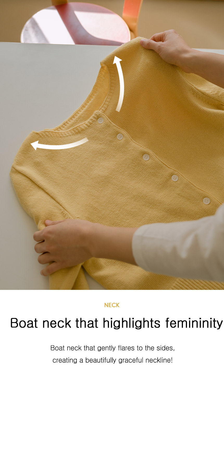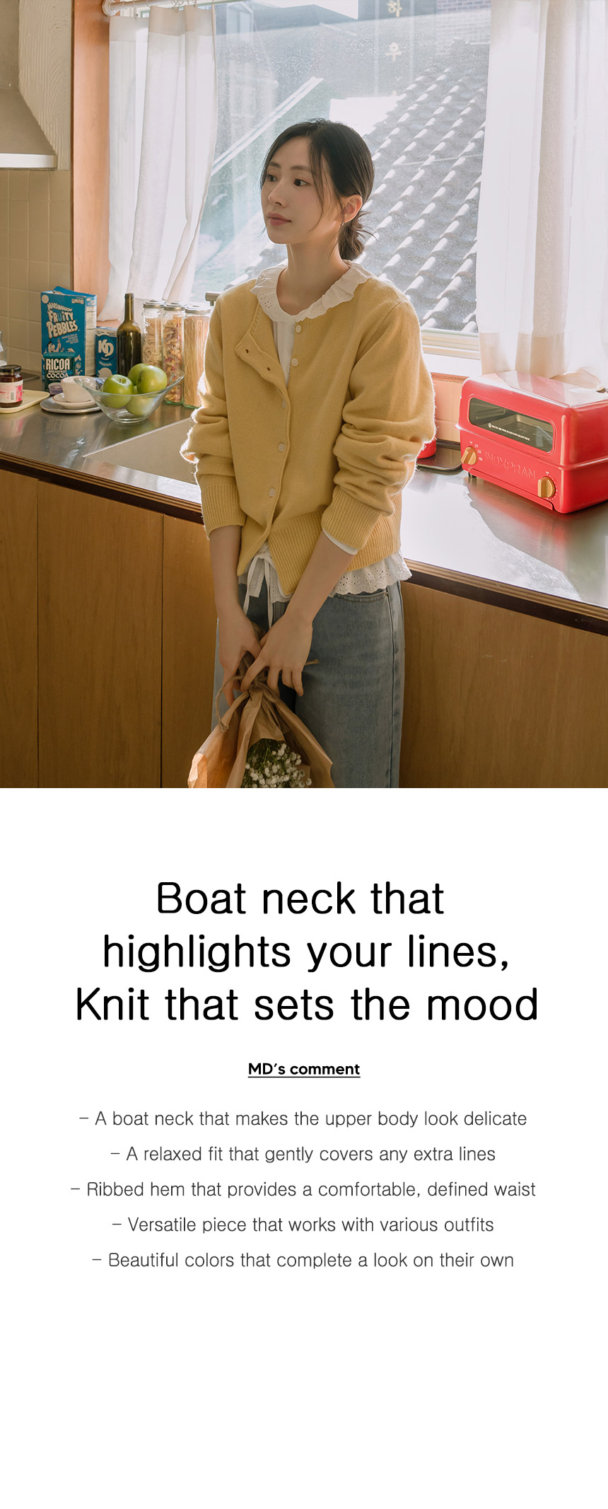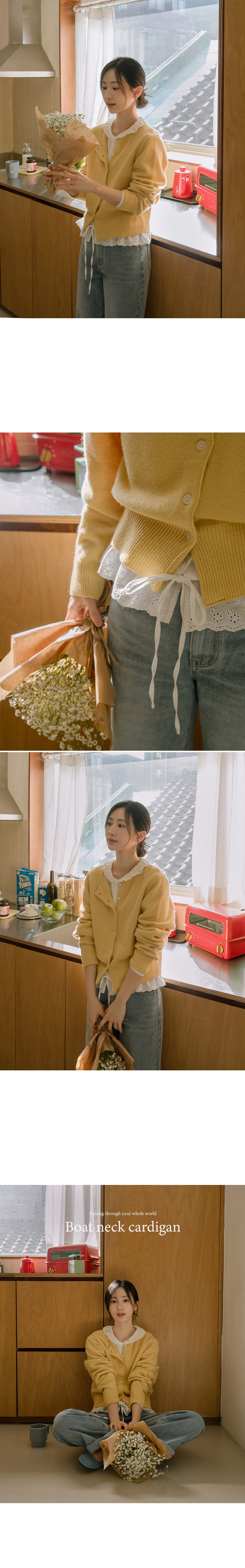 This cardigan features a feminine boat neck as its focal point, while the soft yet structured knit and slim hem create a delicate, refined look.
