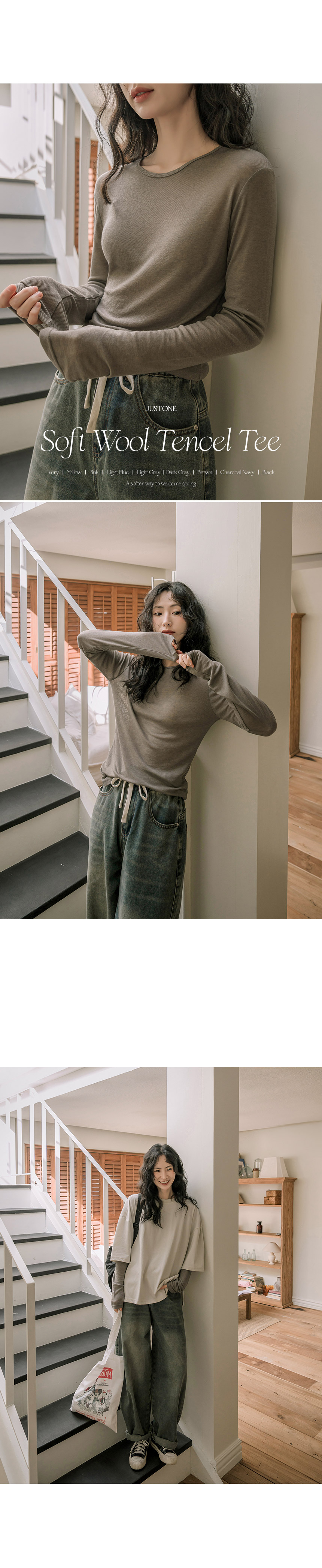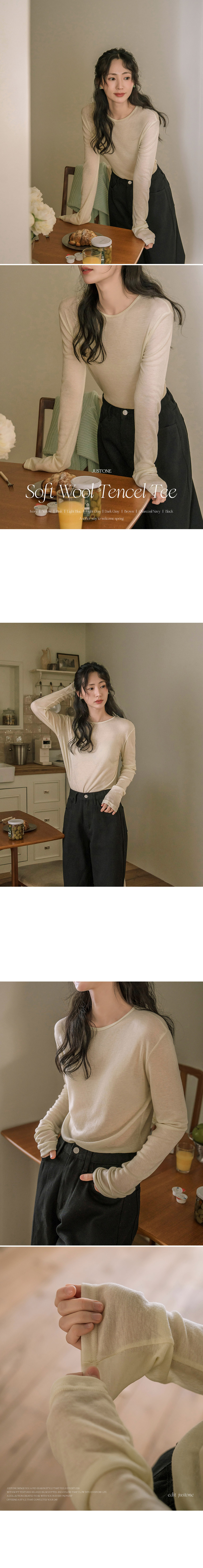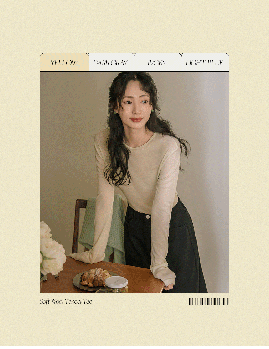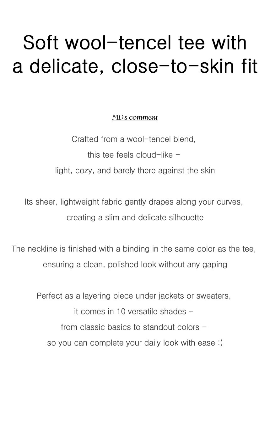 This T-shirt, crafted from a tencel-wool blend, feels as light and cozy as a cloud—almost like wearing it inside out! The thin, slightly sheer fabric creates a slim yet delicate silhouette, and its perfect fit makes it ideal for layering.