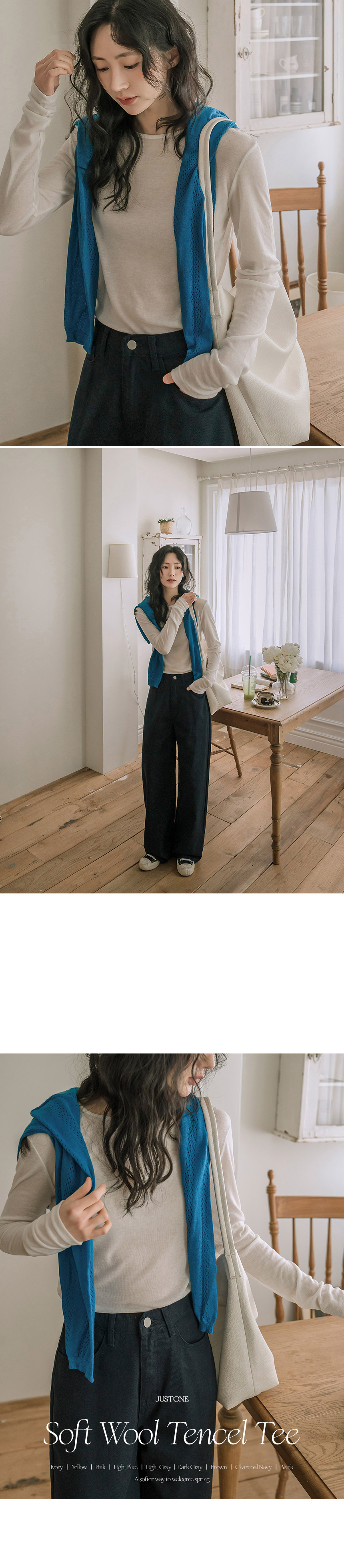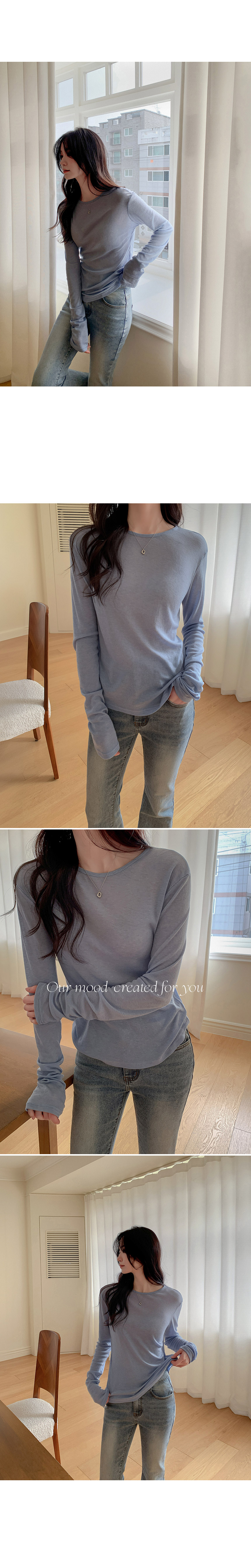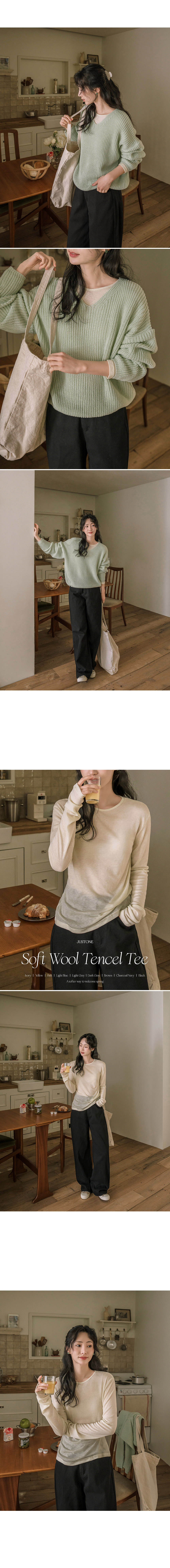 This T-shirt, crafted from a tencel-wool blend, feels as light and cozy as a cloud—almost like wearing it inside out! The thin, slightly sheer fabric creates a slim yet delicate silhouette, and its perfect fit makes it ideal for layering.