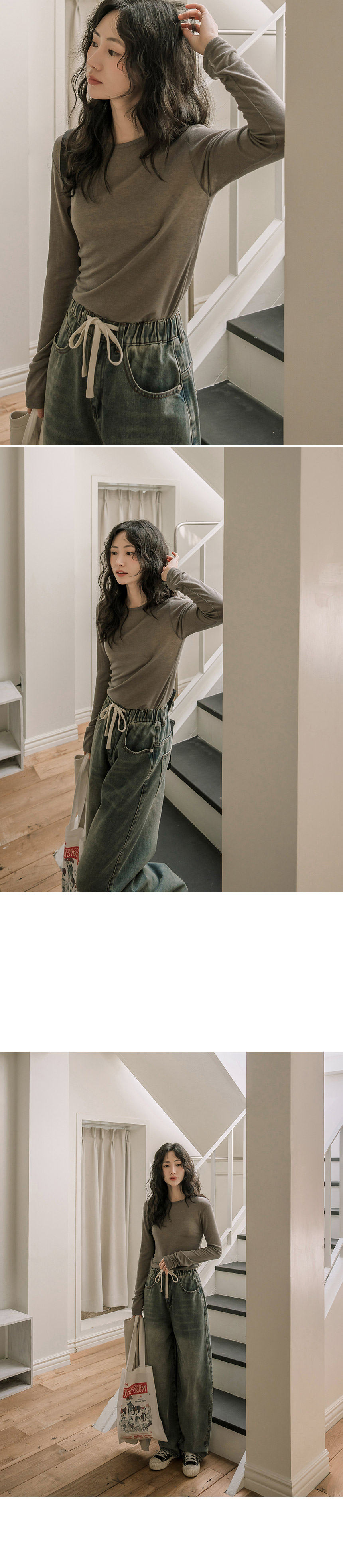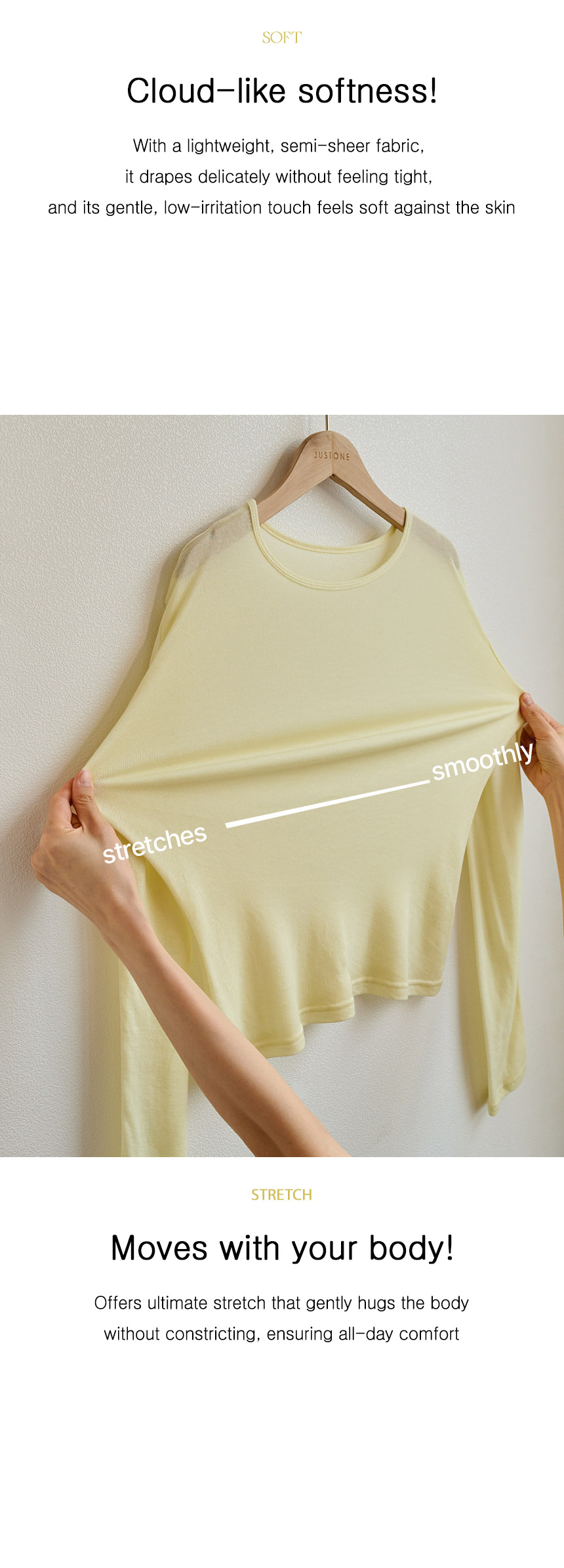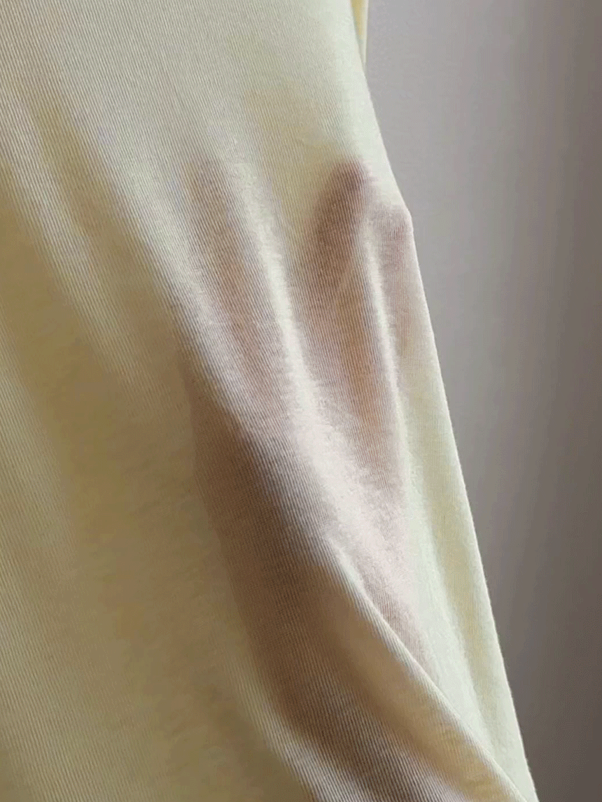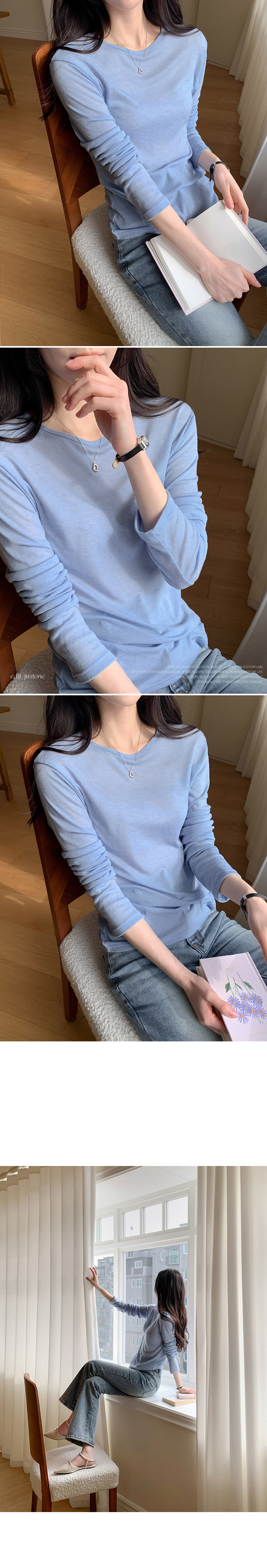This T-shirt, crafted from a tencel-wool blend, feels as light and cozy as a cloud—almost like wearing it inside out! The thin, slightly sheer fabric creates a slim yet delicate silhouette, and its perfect fit makes it ideal for layering.